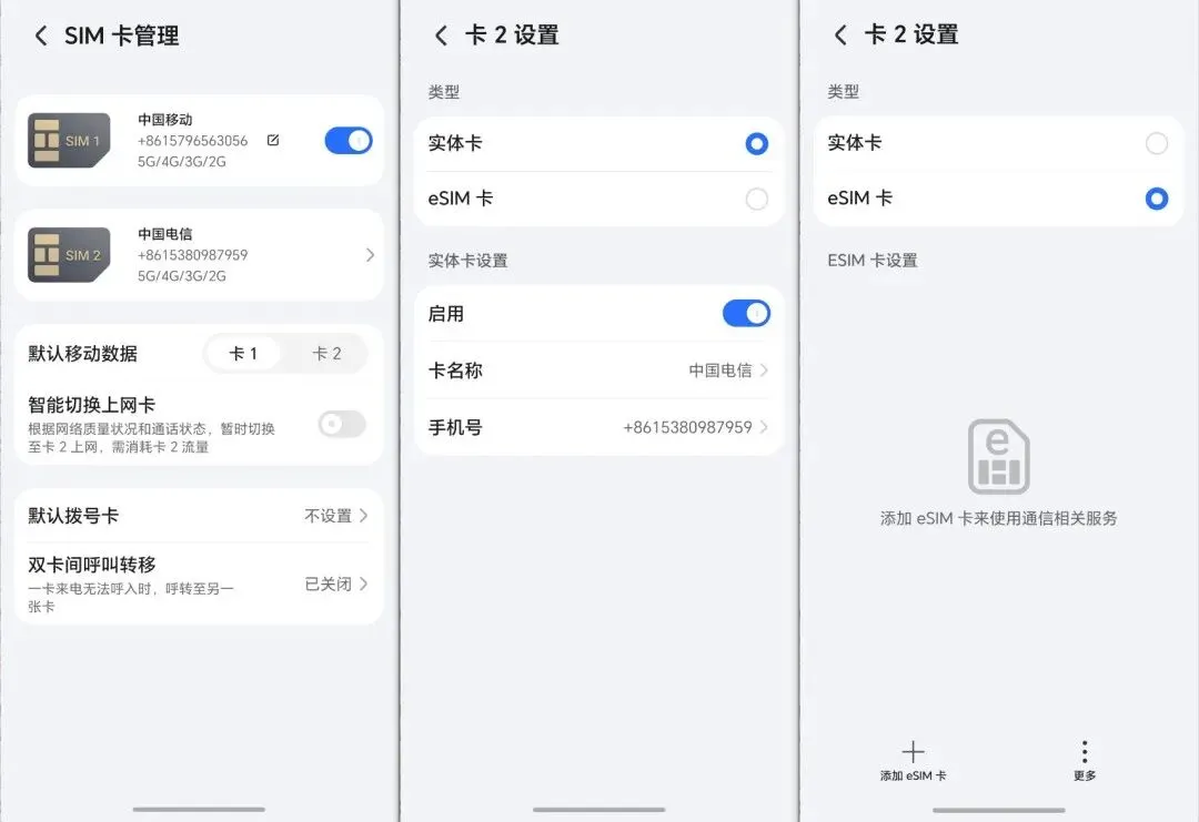 不过到了真正上网和打电话的时候,还是只能同时用两个号码,“卡 1” 只能用 1 张实体SIM卡的号码,“ 卡2 ”可以在实体卡号码 和 2 个 eSIM 号码中三选一。
