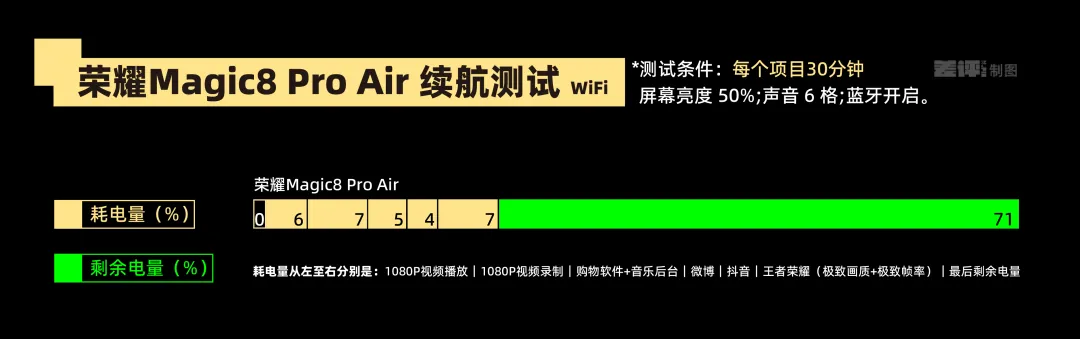 我们用一贯的续航测试方法,在WiFi连接下把视频播放、视频录制、逛淘宝等等这些项目都跑了一轮,Magic8 Pro Air 最终续航成绩是这样的,剩余电量 71% , 比 iPhone Air 的成绩稍微好一点。