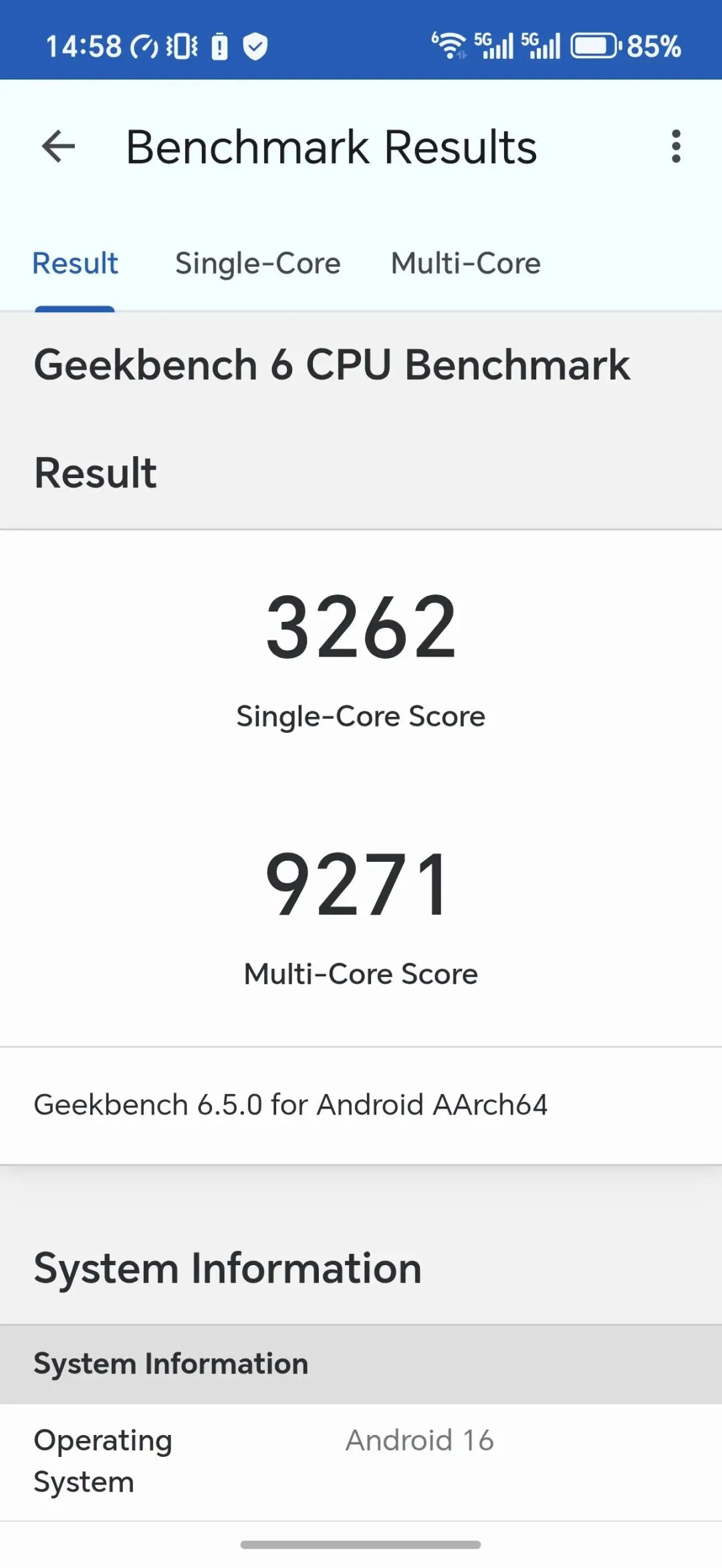 好在另一个跑分软件 Geekbench 顺利完成了测试,荣耀Magic8 Pro Air 最终单核得分3262,多核得分9271。