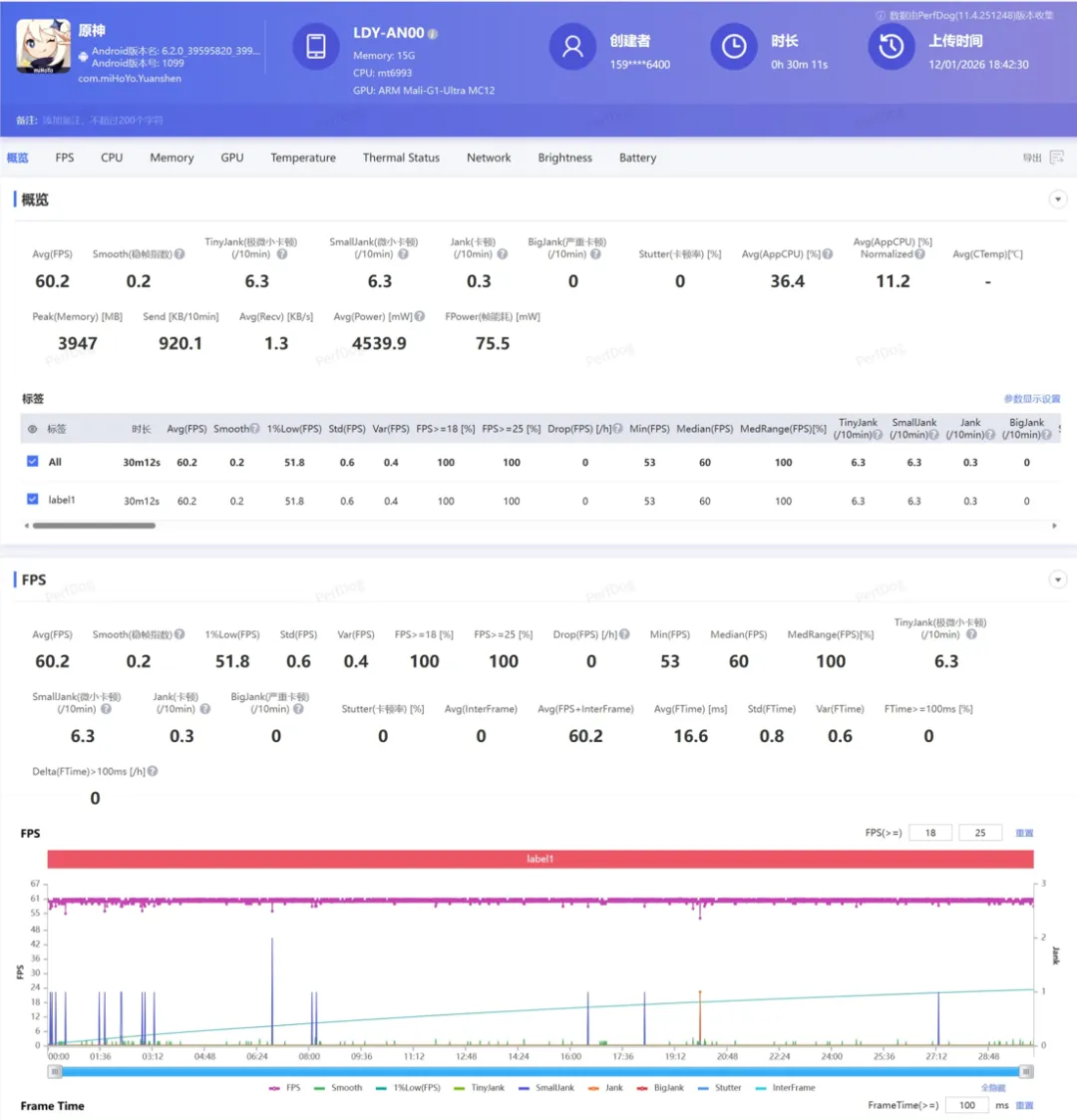 可以看到 Magic8 Pro Air 一开始确实能跑到 60 帧,但是到了四分钟之后帧率就开始逐渐往下降了。