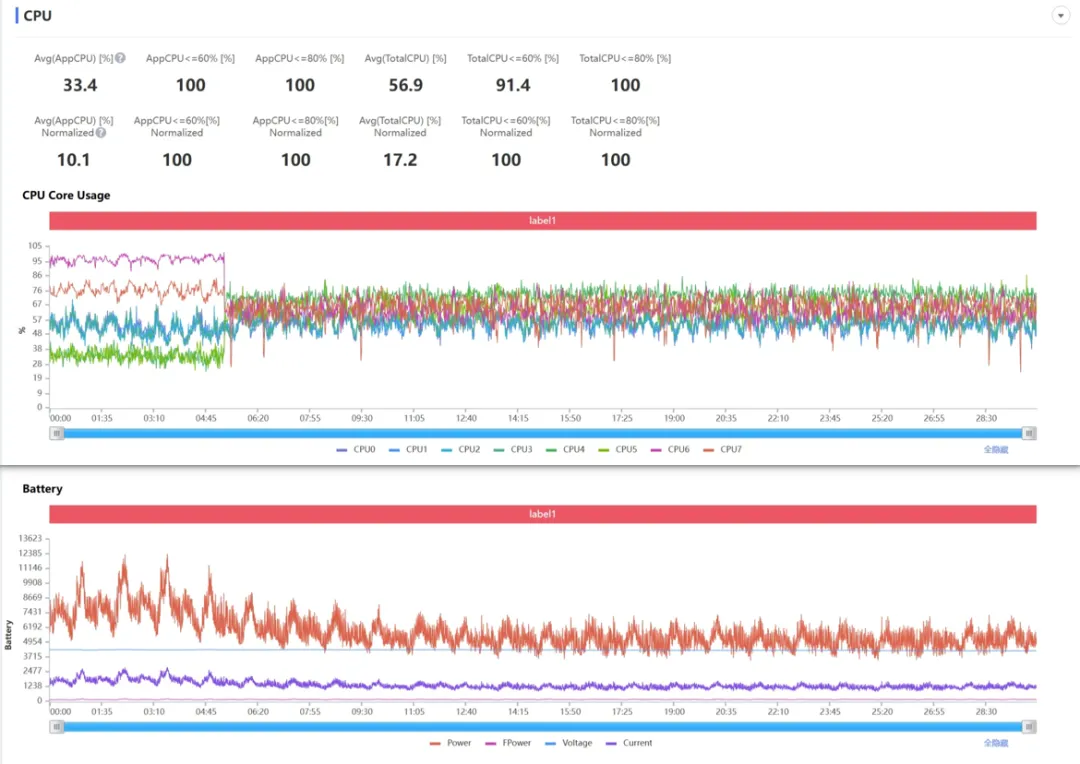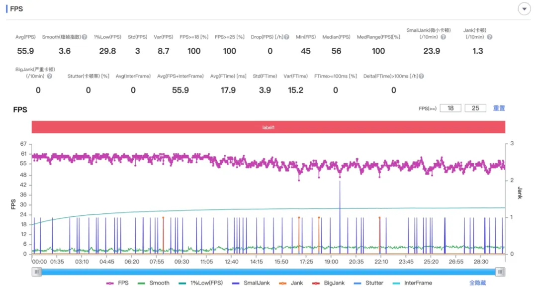 但到了压力比较大的崩铁黄金时刻30分钟跑图,帧率的走势大概是这样的。