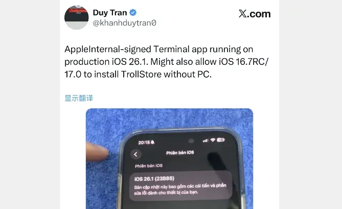 技术大神 Duy Tran 再曝新漏洞,实现 Terminal 终端的安装部署。1 月 18 日午后,Duy Tran 于 X 平台(原推特)发文宣布技术突破:借助苹果内部签名的 Terminal 终端,已在 iOS 26.1 系统上完成成功运行。该漏洞现阶段通杀全系统版本,且暂未向官方提交披露,按照苹果常规修复节奏,预计将在 iOS 26.3 版本中封堵。针对支持 TrollStore 巨魔工具的系统版本 —— 即 iOS 16.7 RC 及以下版本(涵盖 iOS 17.0),可实现 Terminal 终端的无电脑端部署。但需要注意的是,该安装方法的公开时间尚不明确,且一旦技术细节对外披露,苹果大概率会迅速发布补丁进行封堵。--iOS 26.1 × Terminal 终端:运行效果实操演示--据 Duy Tran 透露,当前漏洞不会进行公开操作,一旦外泄,iOS 26.3 版本的漏洞支持将被苹果直接封堵。值得关注的是,关于漏洞提交节点存在一个未知数:是否会调整至 iOS 26.4 版本周期提交,以此让 iOS 26.3 系统也能享有该漏洞的支持权限。