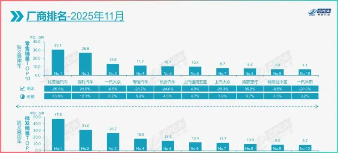 榜首还是比亚迪。30.7万辆,唯一破30万。 但情绪有点拧。 同比-26.5%。