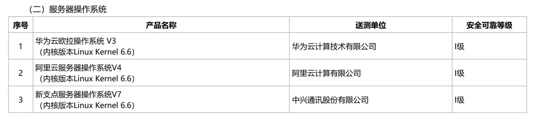 此次一同入选安全可靠测评的还有三个服务器操作系统:华为云欧拉操作系统 V3(内核版本Linux Kernel 6.6),送测单位是华为云计算技术有限公司;阿里云服务器操作系统V4(内核版本Linux Kernel 6.6),送测单位是阿里云计算有限公司;新支点服务器操作系统V7(内核版本Linux Kernel 6.6),中兴通讯股份有限公司,安全可靠等级均为I级。