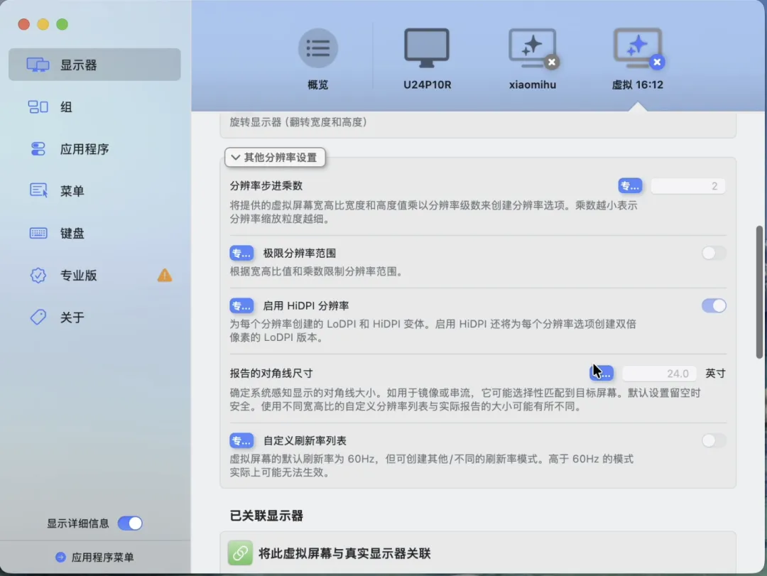 BetterDisplay是一款专为Mac用户打造的显示管理利器,能够深度挖掘显示器潜力,解决Mac系统下显示设置的很多痛点。它最核心的功能是解锁灵活的HiDPI缩放模式,对于非原生适配Mac的显示器,也能通过软件优化实现高清细腻的显示效果,尤其适合设计、剪辑等对画质要求高的用户;那如果你不知道什么是HiDPI,或者你想要了解它的原理以及如何挑选显示器,可以看下我之前的相关视频。它同时支持XDR/HDR亮度提升,最高可达到1600尼特,在强光环境下也能清晰查看屏幕内容。同时它也可以创建虚拟屏幕,实现多任务分屏操作;我们之前视频:将ipad作为Macmini的唯一屏幕用的就是这款软件。虚拟屏幕的功能不用花钱也可以使用。它可以通过DDC硬件控制技术,可直接调节显示器的亮度、对比度、色彩参数,无需手动操作显示器按键;支持多显示器同步设置与布局保护,避免切换场景后重新调整。