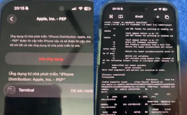 他展示了一项新发现的漏洞,成功在 iOS 26.1 系统上,在没有连接电脑的情况下,运行了苹果内部签名的 Terminal(终端)应用。