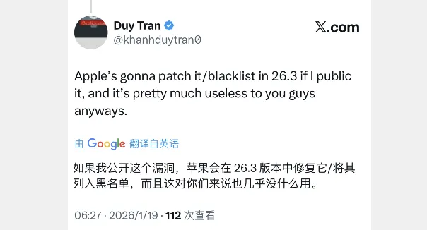 玩机圈总是充满惊喜。就在昨天(1 月 18 日)下午,安全研究员 Duy Tran 在 X(推特)上扔出了一枚重磅炸弹。
