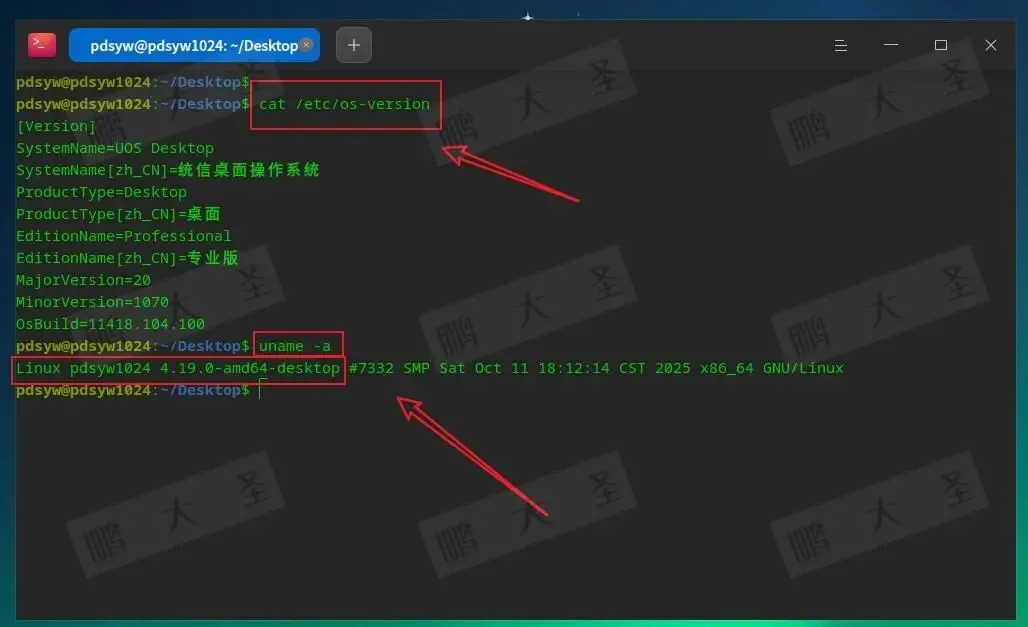 pdsyw@pdsyw1024:~/Desktop$ cat /etc/os-version[Version]SystemName=UOS DesktopSystemName[zh_CN]=统信桌面操作系统ProductType=DesktopProductType[zh_CN]=桌面EditionName=ProfessionalEditionName[zh_CN]=专业版MajorVersion=20MinorVersion=1070OsBuild=11418.104.100pdsyw@pdsyw1024:~/Desktop$ uname -aLinux pdsyw1024 4.19.0-amd64-desktop#7332SMP Sat Oct 11 18:12:14 CST 2025 x86_64 GNU/Linux