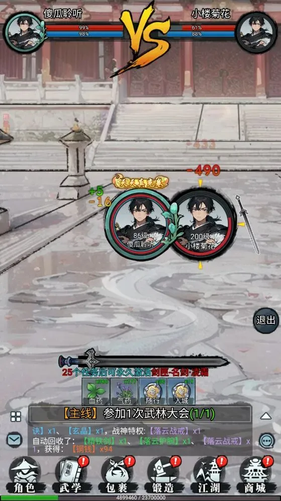 6、接下来就会解锁江湖玩法了,可以先前往百晓生界面来一键领取各种兵器谱套装,再参与一下武林大会对决,支持实时匹配对决进行战斗