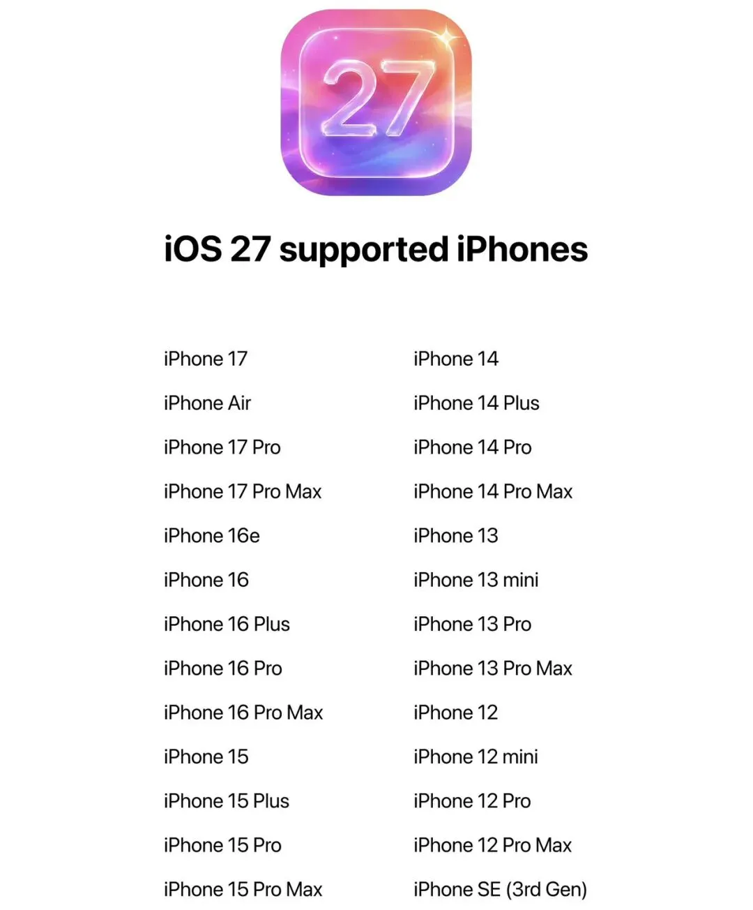 总结: iOS 27不支持机型iPhone 11及更早机型、第一代/第二代iPhone SE