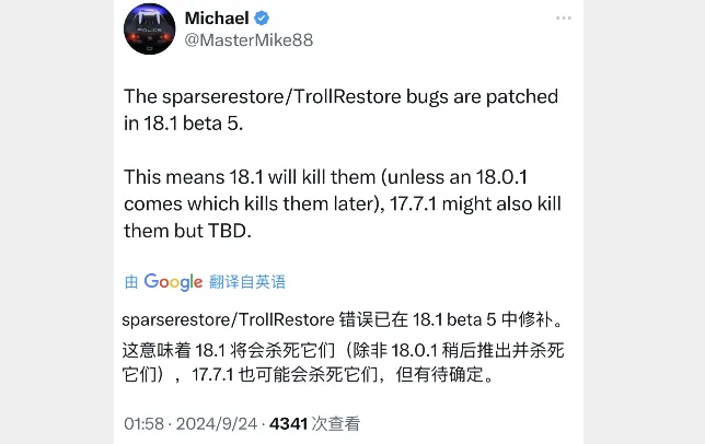 大概率会在 iOS 17.7.1 和 18.1 及更高系统中修补此方法,在这些系统中将无法使用sparserestore 和 TrollRestore 工具。