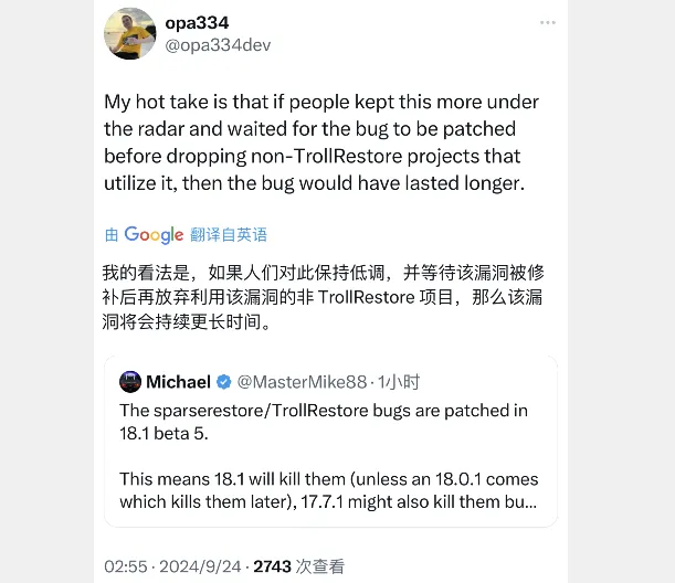 opa334大神对此事发表看法,如果不是被提前泄露,或许这种方法将会持续更长的时间,现在已经在最新系统封堵了,巨魔难度又一次加强了,你们没事别升级到 iOS 17.7.1 或者 18.1 及更高系统,不然离巨魔更加遥远。