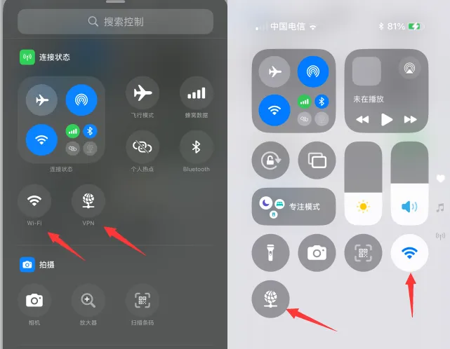 控制中心连接状态分出WiFi和VPN: