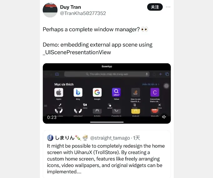 一旦方法公开后,意味着很多开发者将会参考他。市面上出现巨魔分屏的工具,基本上都是参考 Frontboardapplauncher 项目,有了这个方法后,在巨魔环境下,使用它更加完美体现多屏功能。