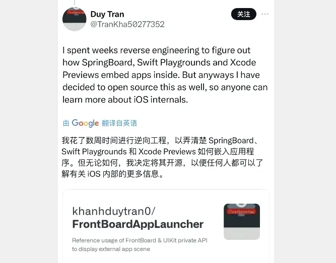 随后!发布了 Frontboardapplauncher 巨魔多屏工具,并且还对此项目进行开源,也是作者首发的第一版巨魔多屏工具,虽然并不美观,但确实实现多屏,重点是开源了。