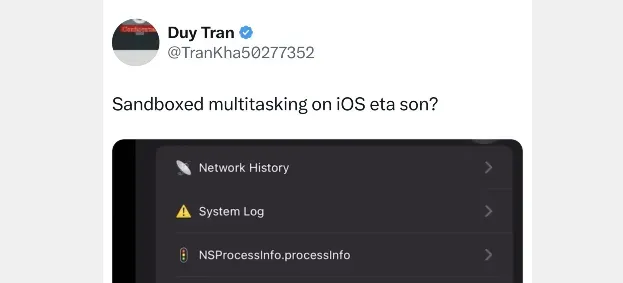你以为这样就完了吗?在5月4日 DuyTran 大神又带来一条劲爆消息,不需要巨魔和越狱也能实现启用多屏,在 iOS 上进行沙盒多任务处理,很有可能会公开,目前已经发给几位网友测试。