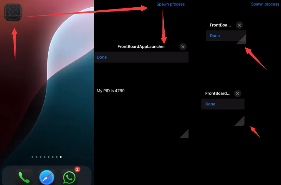 应该是 DuyTran 大神应该是最早发现的,使用_UIScenePresentationView 嵌入外部应用程序场景,实现多任务管理,也就是你们所说的多屏功能。