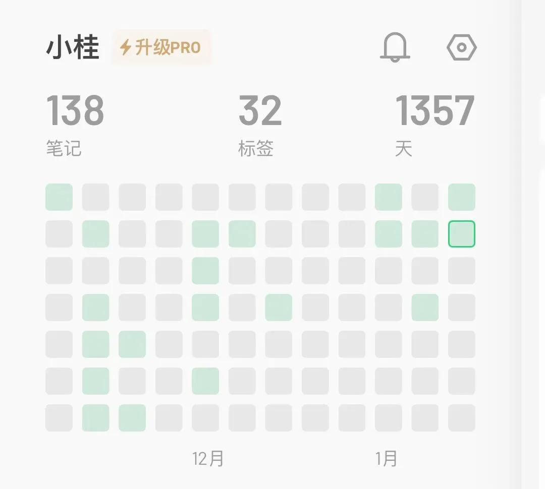 flomo有个很有趣的设计——热力图。每天你记了多少笔记,就会在日历上涂上不同深度的格子,记的越多颜色越深。