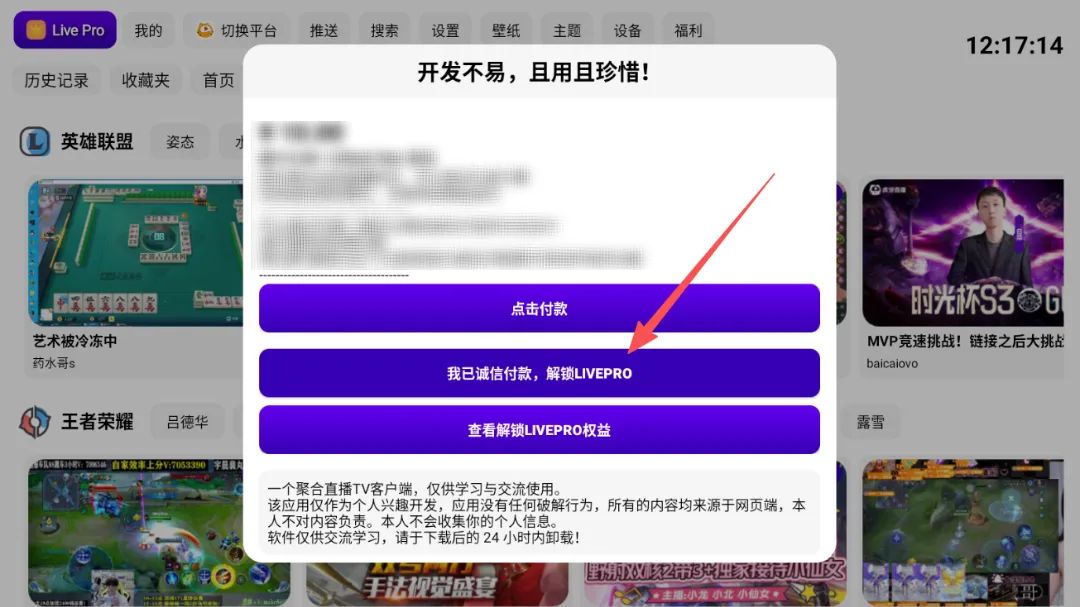 进入之后这边大家可以先激活一下会员功能,操作很简单,点击左上角LivePro,然后再点击第二条选项,就可以成功激活了。