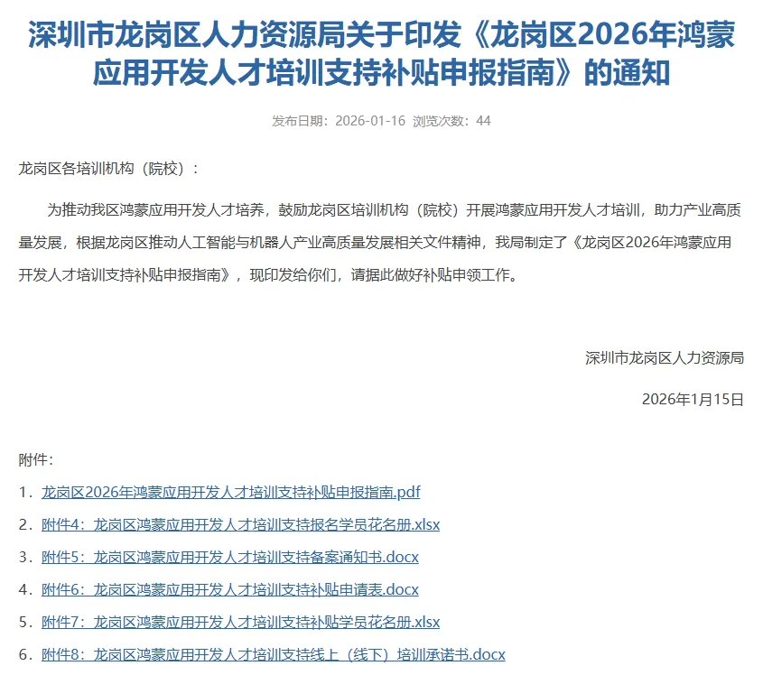 为推动我区鸿蒙应用开发人才培养,鼓励龙岗区培训机构(院校)开展鸿蒙应用开发人才培训,助力产业高质量发展,根据龙岗区推动人工智能与机器人产业高质量发展相关文件精神,制定《龙岗区 2026 年鸿蒙应用开发人才培训支持补贴申报指南》。