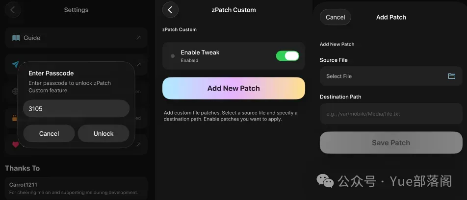 点击 Enable zPatch Custom,输入代码 3105,即可解锁自定义修改功能。