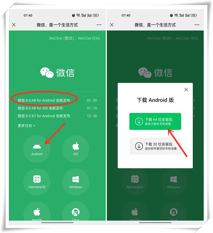 第二步:在微信官方网站中可以看到1月20日就发布了安卓微信8.0.68正式版,所以我们可以手动下载最新版本安装包,只需要点击“Android”,并点击【下载64位安装包】按钮。