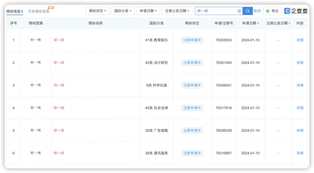 近期,腾讯注册了多枚「听一听」商标,目前处于注册申请状态。