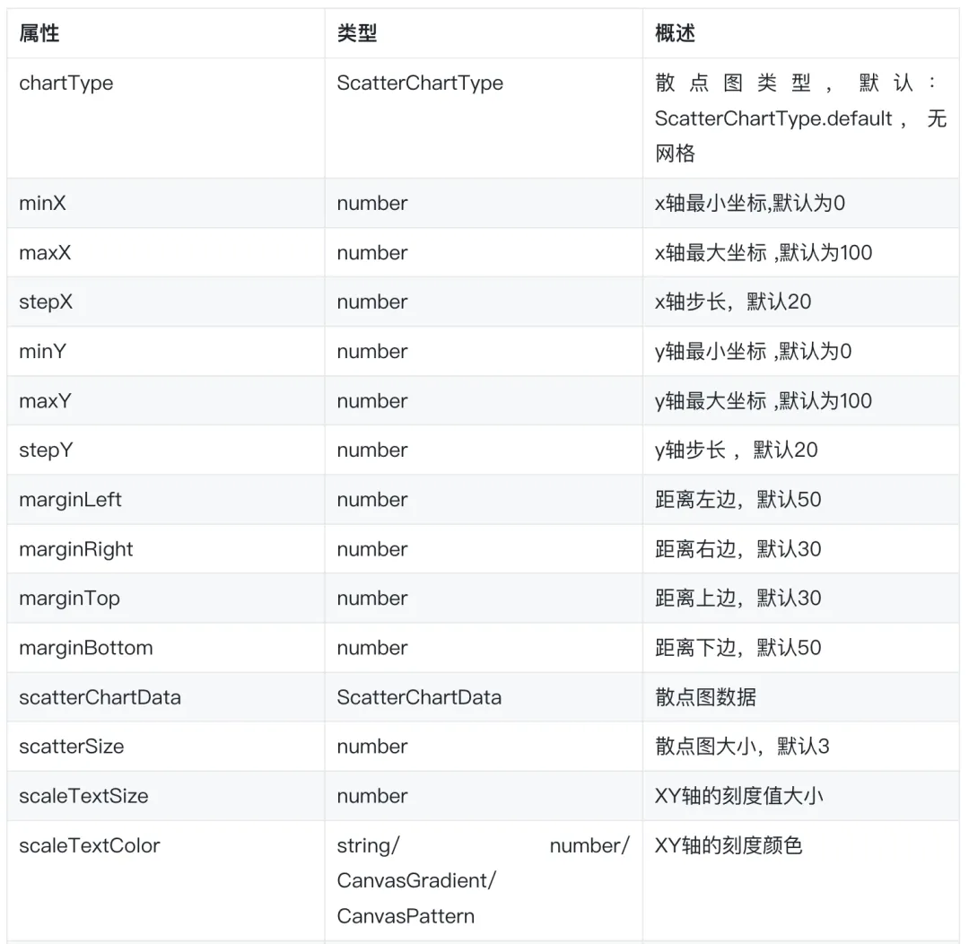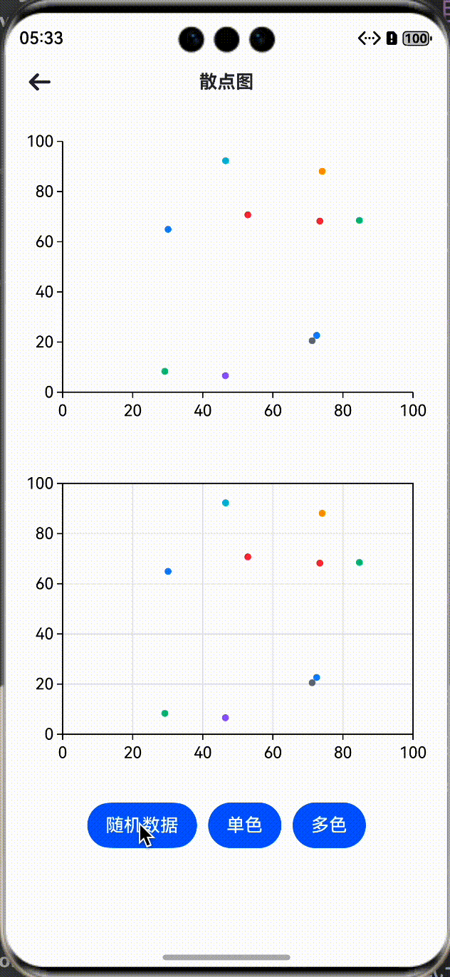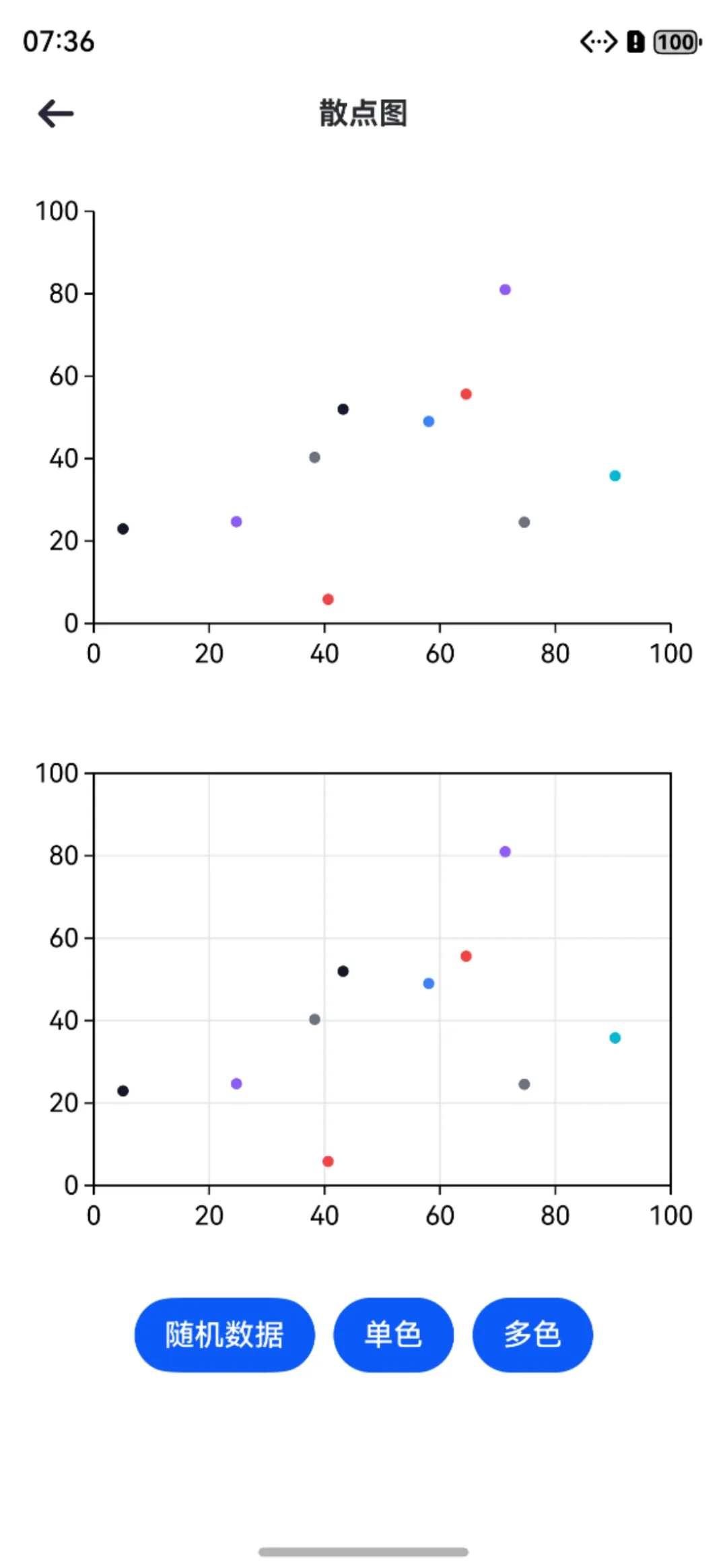 ScatterChartView({ scatterChartData: this.scatterChartData}) .width("100%") .height(300)ScatterChartView({ scatterChartData: this.scatterChartData, chartType: ScatterChartType.grid}) .width("100%") .height(300)import { ScatterChartData, ScatterChartType, ScatterChartView } from'@abner/scatter'import { ActionBar } from'../../view/ActionBar'/** *AUTHOR:AbnerMing *DATE:2026/1/17 *INTRODUCE:散点图 */@Entry@ComponentV2 struct ScatterChartPage {private colorArray: string[] = ['#3b82f6', '#ef4444', '#10b981', '#f59e0b','#8b5cf6', '#06b6d4', '#6b7280', '#111827' ];private singleColor: string = '#3b82f6';@Local useMultiColor: boolean = true@Local scatterChartData: ScatterChartData[] = [] aboutToAppear(): void {this.generateRandomPoints(10) } build() { Column() { ActionBar({ title: "散点图" }) ScatterChartView({ scatterChartData: this.scatterChartData }) .width("100%") .height(300) ScatterChartView({ scatterChartData: this.scatterChartData, chartType: ScatterChartType.grid }) .width("100%") .height(300) Row() { Button("随机数据") .onClick(() => {this.generateRandomPoints(10) }) Button("单色") .onClick(() => {this.useMultiColor = falsethis.generateRandomPoints(10) }) .margin({ left: 10 }) Button("多色") .margin({ left: 10 }) .onClick(() => {this.useMultiColor = truethis.generateRandomPoints(10) }) }.margin({ top: 10 }) }.width("100%") .height("100%") }// 生成随机数据点private generateRandomPoints(count: number) {this.scatterChartData = [];for (let i = 0; i < count; i++) {this.addRandomPoint(); } }// 添加单个随机数据点private addRandomPoint() {const x = Math.random() * (100 - 0);const y = Math.random() * (100 - 0);const color =this.useMultiColor ? this.colorArray[Math.floor(Math.random() * this.colorArray.length)] : this.singleColor;this.scatterChartData.push({ x: parseFloat(x.toFixed(2)), y: parseFloat(y.toFixed(2)), color: color }) } }属性介绍