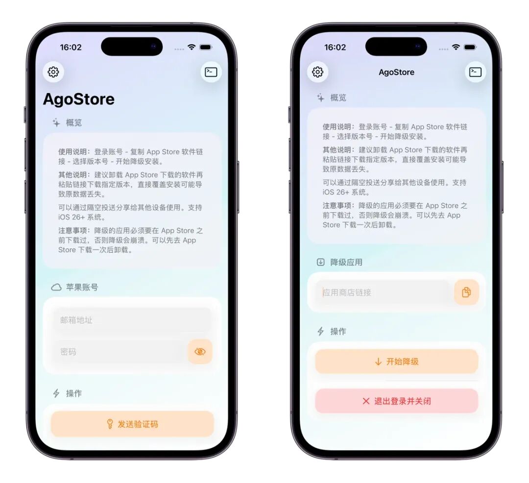 今天介绍的这个是AgoStore 应用降级,它支持 iOS16 到 iOS26 以上的系统,大多数 iPhone 都能用。