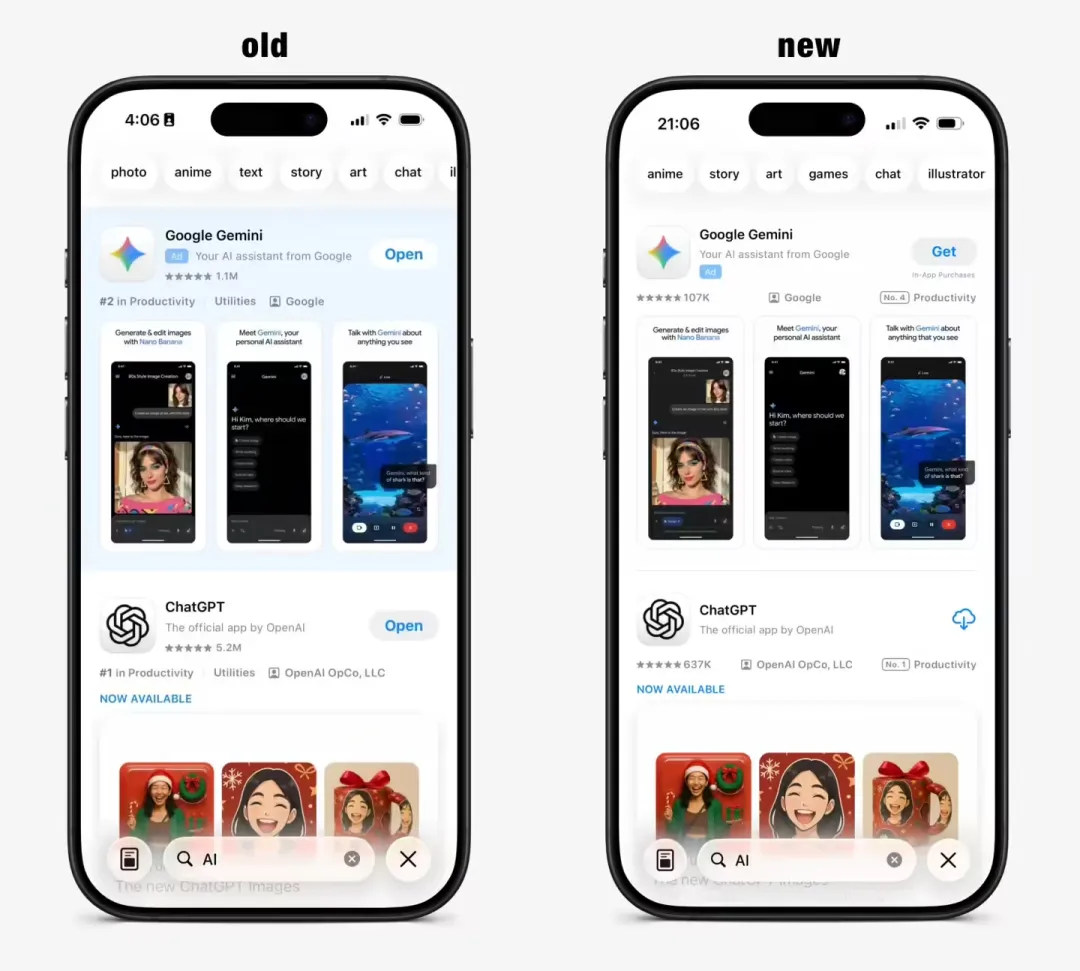 在 iOS 26.3 系统中,苹果正测试全新的 App Store 搜索广告设计,核心变化在于移除了付费推广结果原本特有的蓝色背景。