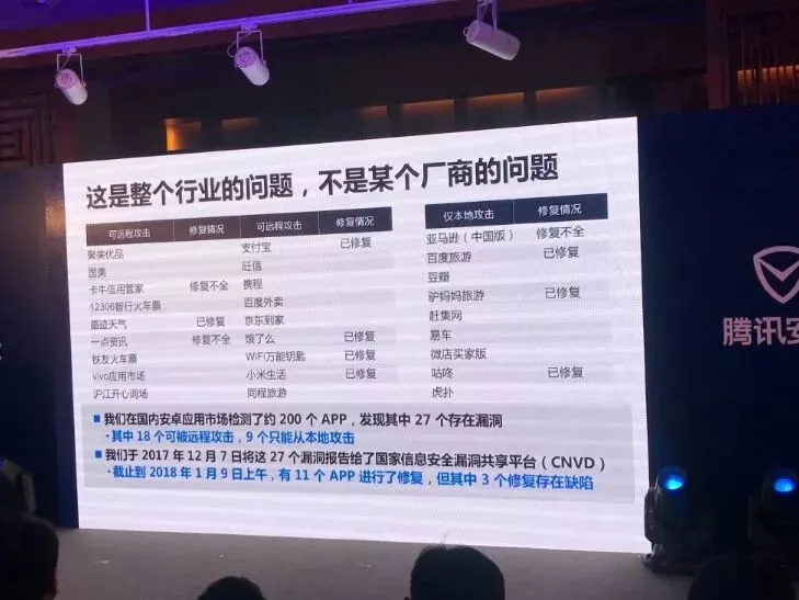腾讯安全玄武实验室在国内安卓应用市场上检测了大概200个应用,发现有27个存在问题,其中18个App可以被远程攻击,即通过短信链接复制。另外9个App只能从本地被攻击,即通过手机上装载的恶意应用实现类似“克隆”功能。