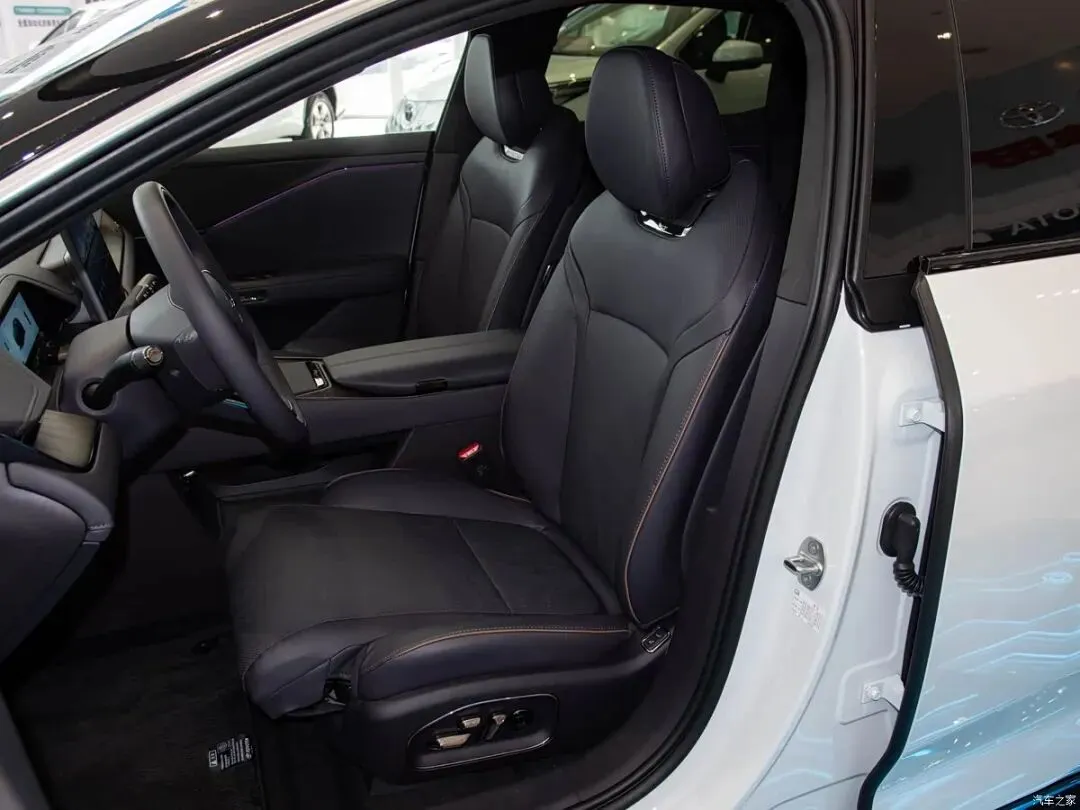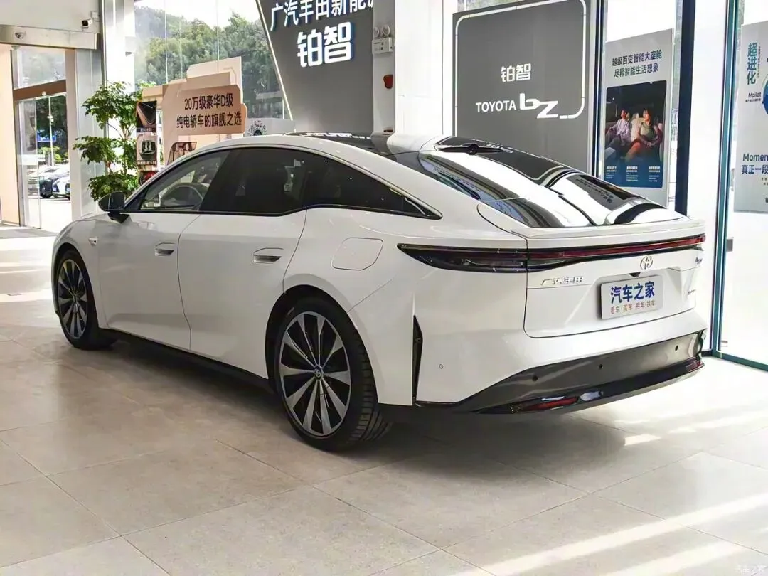 铂智7前脸沿用丰田C字形贯穿日行灯,上下灯组分体布局,主大灯与导流槽一体,前唇自带竞技味;车顶激光雷达显眼,车身提供七款外漆可选。侧视姿态低趴修长,四门轿跑轮廓配合立体折线,视觉重心被腰线一路拉后;半藏式门把手首次上车,搭配加大轮毂。三围5130×1965×1506 mm,轴距3020 mm,定格中大型身段。车尾全景天幕向后延伸,与尾窗无缝衔接,轿跑弧线一气呵成;贯穿尾灯呼应前脸C型主题,后杠两侧同样开有导流槽,层次干净,观感利落。座舱走极简路线,木纹饰板与大面积软包交错,氛围灯随音乐律动。鸿蒙座舱5.0全系标配,支持模糊语义+四音区连续对话;内置MoLA大模型可“长记忆”,自动记录并调用每位家人的偏好设置。仪表屏可切换多种行车数据,并支持人脸识别与HUD抬显;全车多扬声器布局同步到位。怀挡腾出中控下方区域,双手机无线充面板+快捷实体键一字排开,底部掏空形成超大置物槽,随放随走。零重力座椅全系标配通风、加热、八点按摩,靠背、座垫、腿托一体调节,可放平至“失重”角度。智驾部分接入Momenta端到端大模型,城快、高速双场景高阶辅助驾驶一键激活。动力交由华为DriveOne双电机系统,峰值功率207 kW,匹配中航新航磷酸铁锂电池,极速锁定180 km/h。工信部目录显示,铂智7提供两款电池包:88.13 kWh版本对应CLTC 680/700/710 km三档续航,71.35 kWh版本则为600 km。底盘换装双腔空悬,车身高度和阻尼软硬可分开调;自带“智能预瞄”,提前扫路面,自动把悬架调到最佳状态。