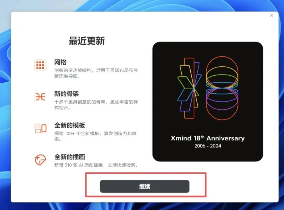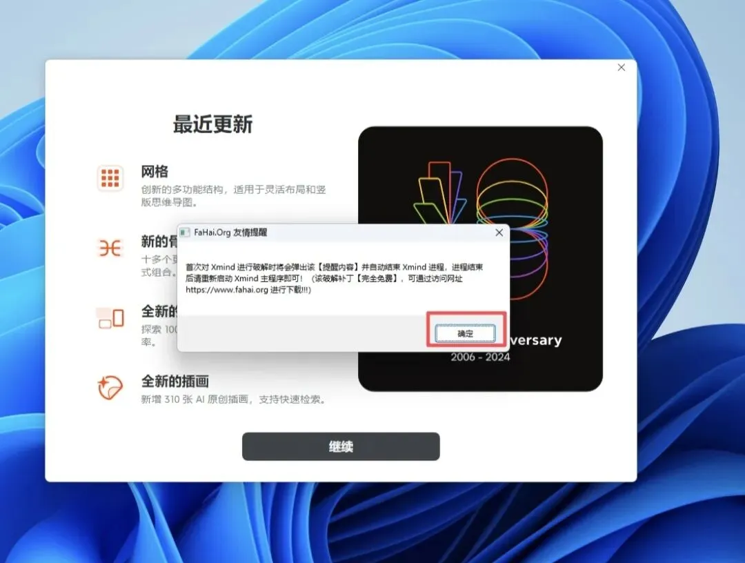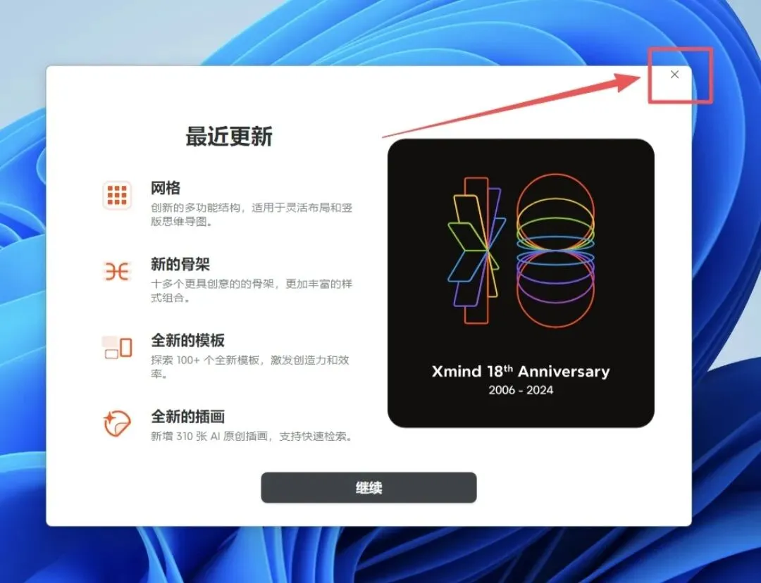 5、安装完成,弹出如下窗口,直接点击右上角的×,关闭即可。9、打开软件安装目录,右键单击【Xmind】,选择【打开文件所在的位置】10、Ctrl+V,把刚才复制的dll文件粘贴进来。12、首次打开会有一个【友情提醒】,点【确定】会关闭软件,重新打开软件即可。15、关闭更新,点击左下角【首选项】,自动更新栏,选择【关闭自动更新】,避免激活失效。到此,整个安装激活过程都已完成。可以开始正常使用软件。