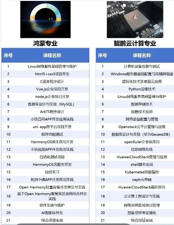 聚焦鸿蒙OS应用开发、分布式架构设计,学生通过系统学习云计算、数据通信、虚拟化技术、容器化部署、鸿蒙应用开发等核心技术,将掌握从APP开发到智能终端适配的全流程技能,参与智能家居、工业物联网等场景的鸿蒙生态项目。围绕鲲鹏服务器运维、云平台搭建、数据通信、虚拟化技术、容器化部署、鸿蒙应用开发等核心技术,深度对接华为云服务体系,学生可考取华为云计算HCIA/HCIP认证,毕业即具备云架构部署与管理能力。