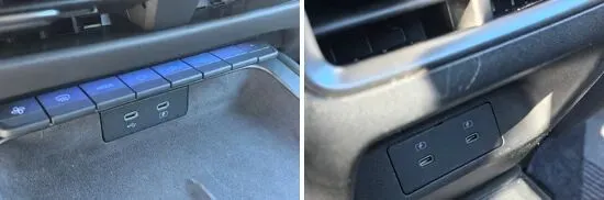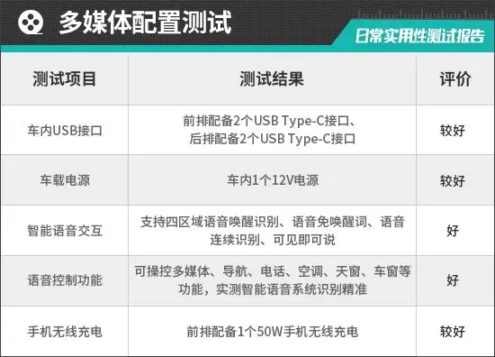 评测车共配备4个USB接口,其中,前排配备2个USB Type-C接口,后排配备2个USB Type-C接口,接口数量可圈可点但种类单一。同时,车内还有1个12V电源接口,基本能够满足车内乘客电子设备的用电需求。