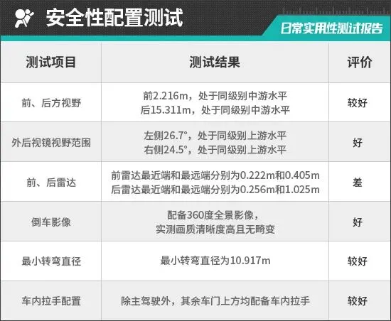 评测车的左/右外后视镜采用普通镜片,经实测,左、右外后视镜视野范围分别为26.7°和24.5°,在测试过的同级别车型中均处于上游水平。