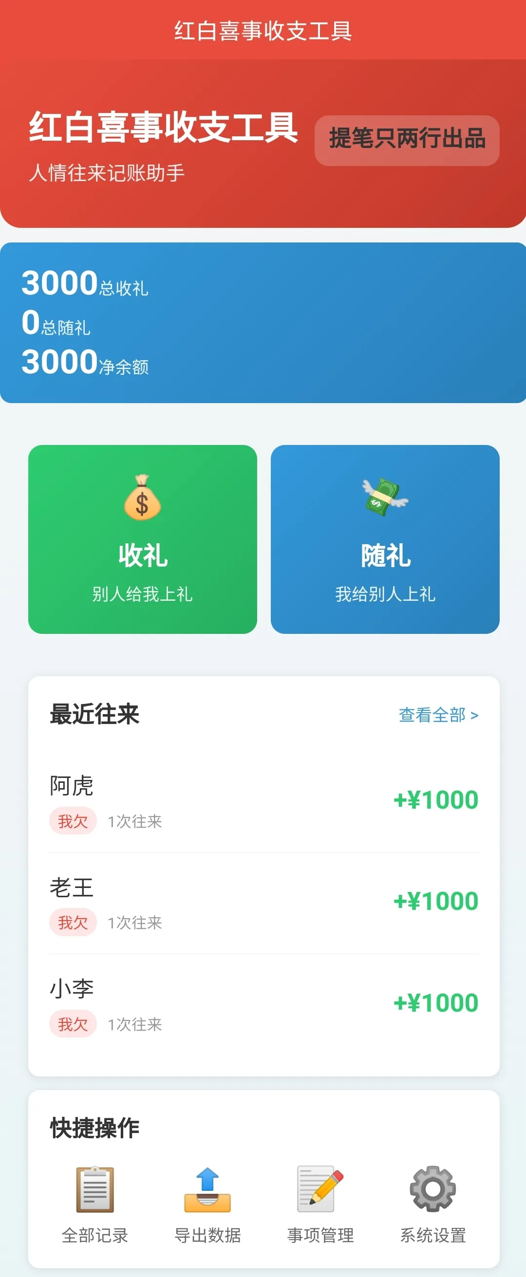 电脑版的,我这儿也一并给大家提一下《电子礼簿系统win版》!这款电脑端的同样是纯本地运行,无广告无弹窗,也不用联网登录,数据全存在你自己的电脑硬盘里,完全能长久稳定使用!