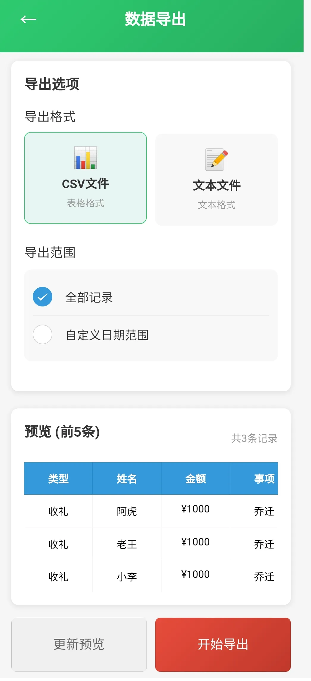 兼容CSV和TXT两种格式导出,CSV格式文件能直接用Excel打开,便于打印对账或者分享给家里人;要是导出操做失败,系统会自动支持手动复制内容,粘贴到别的文档里就行。