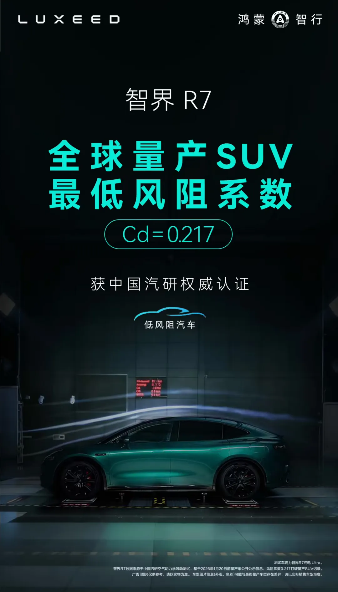 1月22日消息,鸿蒙智行官方宣布,旗下智界R7车型已完成专业测试验证,以0.217的超低风阻系数,刷新全球量产SUV风阻系数纪录,彰显了鸿蒙智行在气动设计与新能源技术领域的硬核实力。这一突破不仅优化了车辆能效表现,更树立了同级别车型气动设计的新标杆。