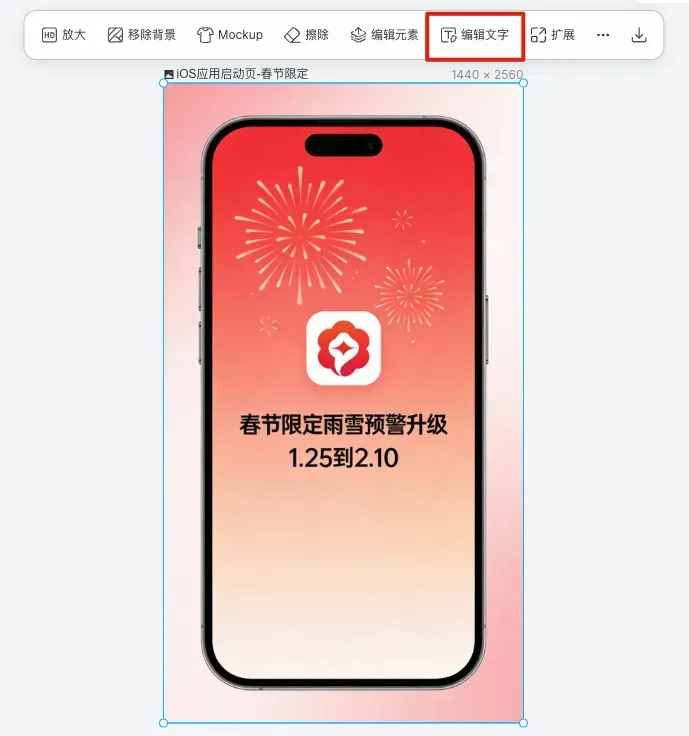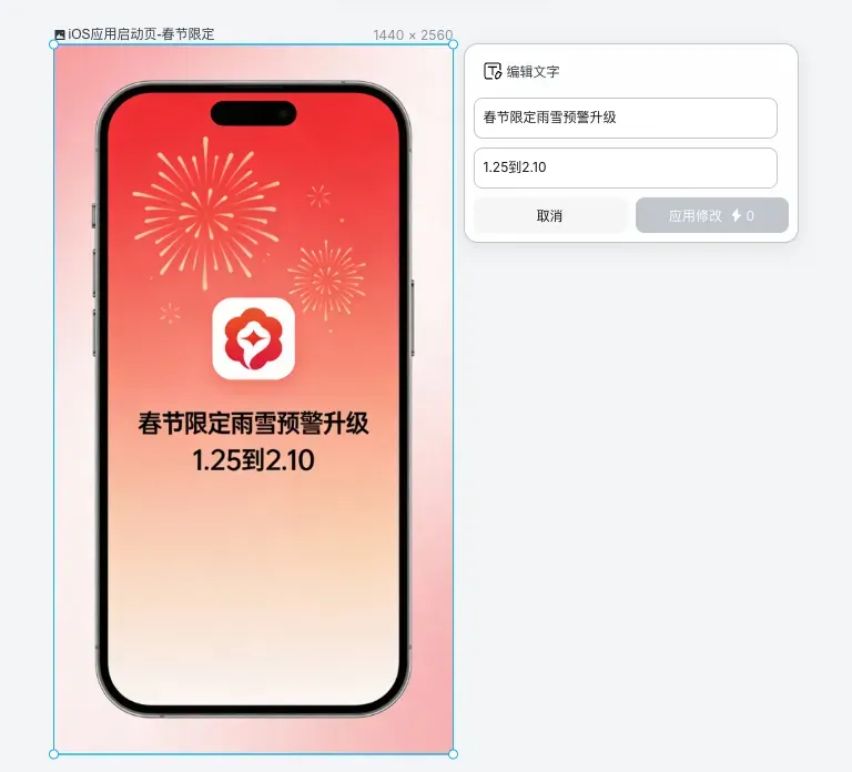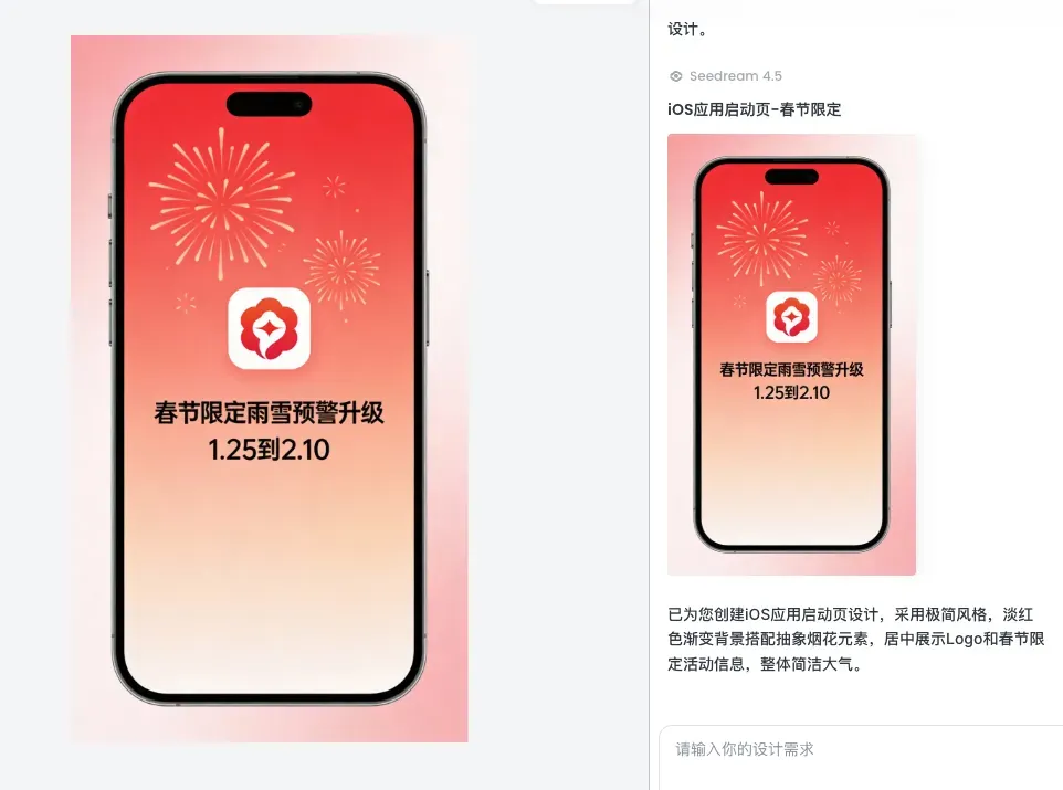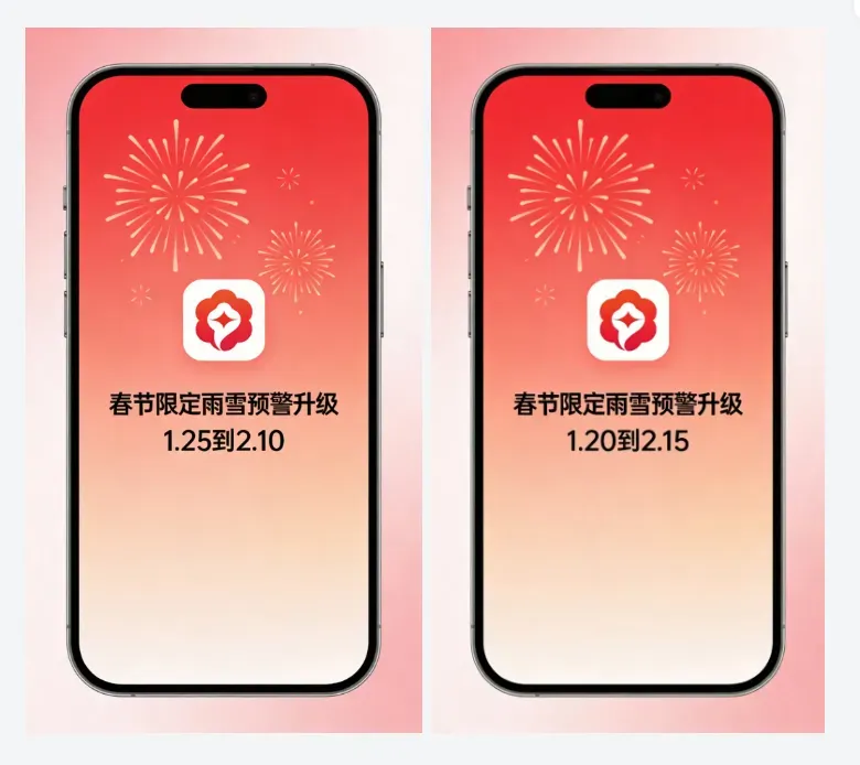 提示词:iOS应用启动页,极简风格,背景为淡红色渐变加抽象烟花元素,居中放置应用Logo,下方显示活动主题春节限定雨雪预警升级和时间1.25到2.10,字体为苹方粗体,整体简洁大气。