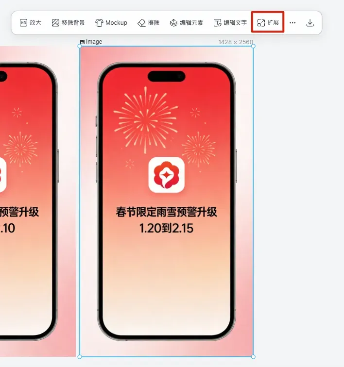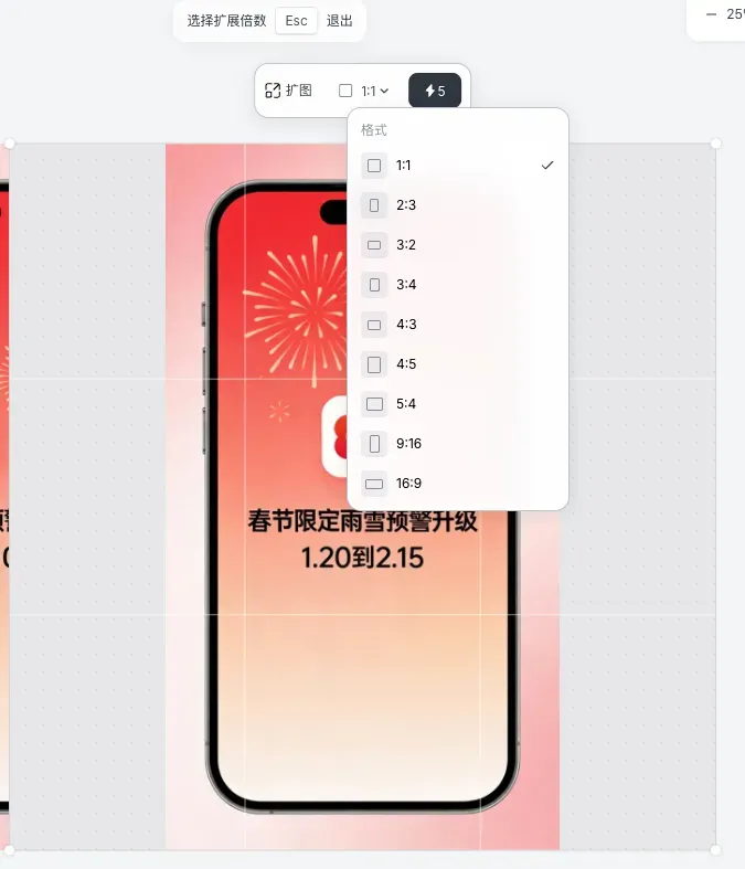 星流有个智能扩图功能,选择标准尺寸后,它会自动扩展边缘内容,画面保持完整。