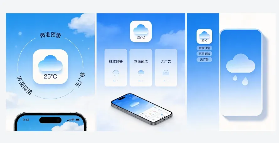提示词:iOS天气类应用的宣传海报,适配小红书风格,突出精准预警、界面简洁、无广告卖点,搭配应用截图,色调为蓝白渐变,批量生成3张不同布局方案,比例3:4