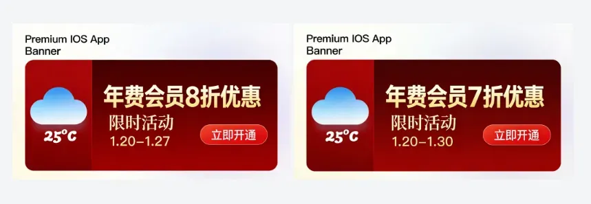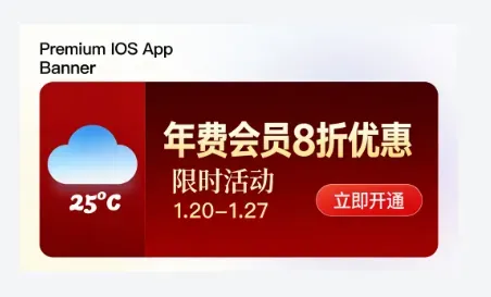 提示词:iOS天气应用限时活动Banner,红色加金色配色,突出年费会员8折优惠,活动时间1.20到1.27,包含立即开通按钮,简约大气风格。