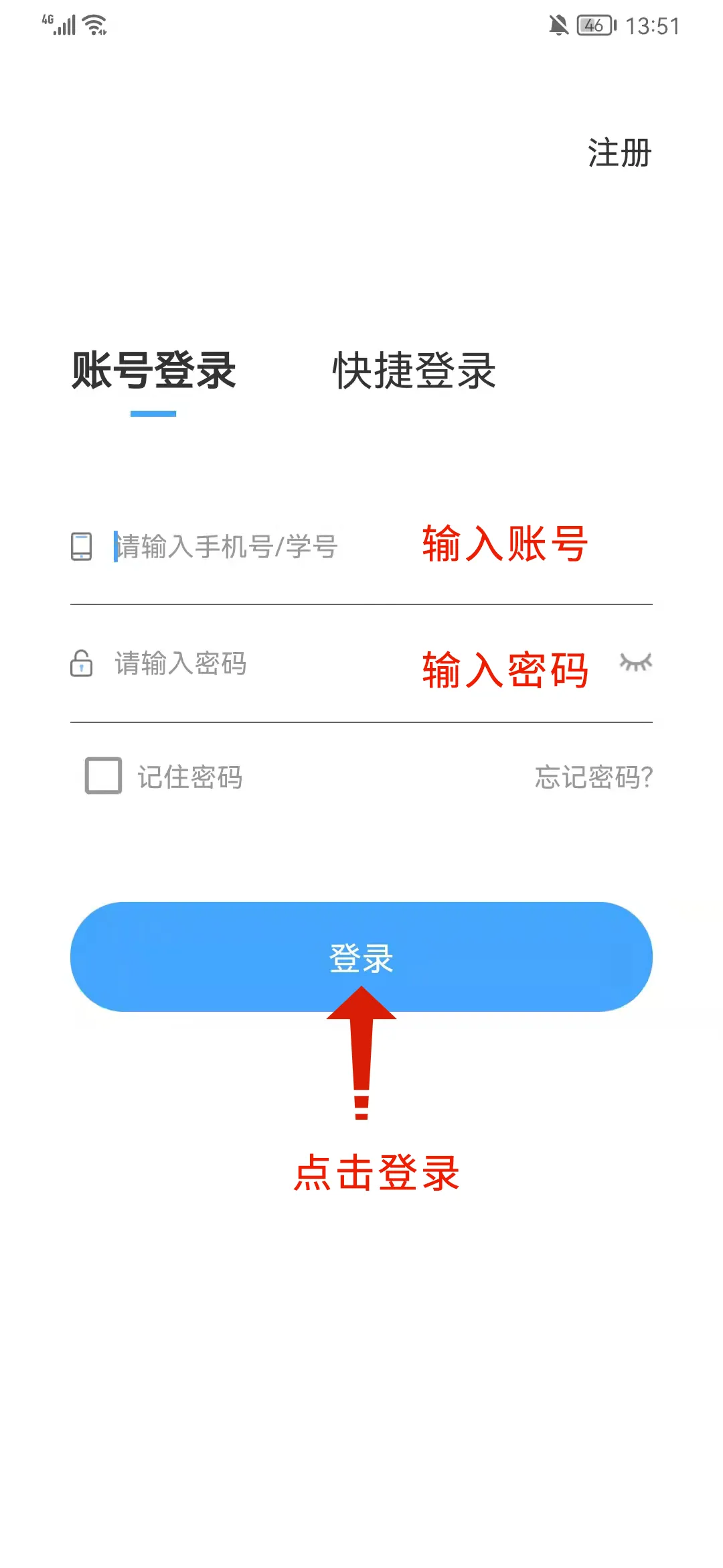 下载软件后打开App登录页面。第一步输入报名手机号;第二步输入登录密码,点击登录。