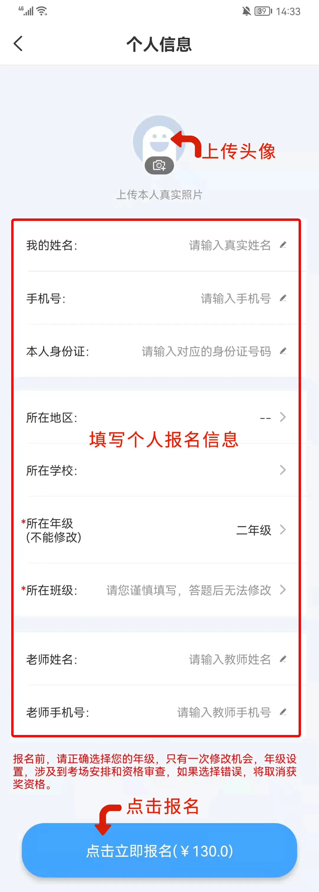 打开App进入首页,个人中心填写正确学生年级(会影响竞赛报名,请正确填写),点击右下角“竞赛”按钮,进入竞赛页面。