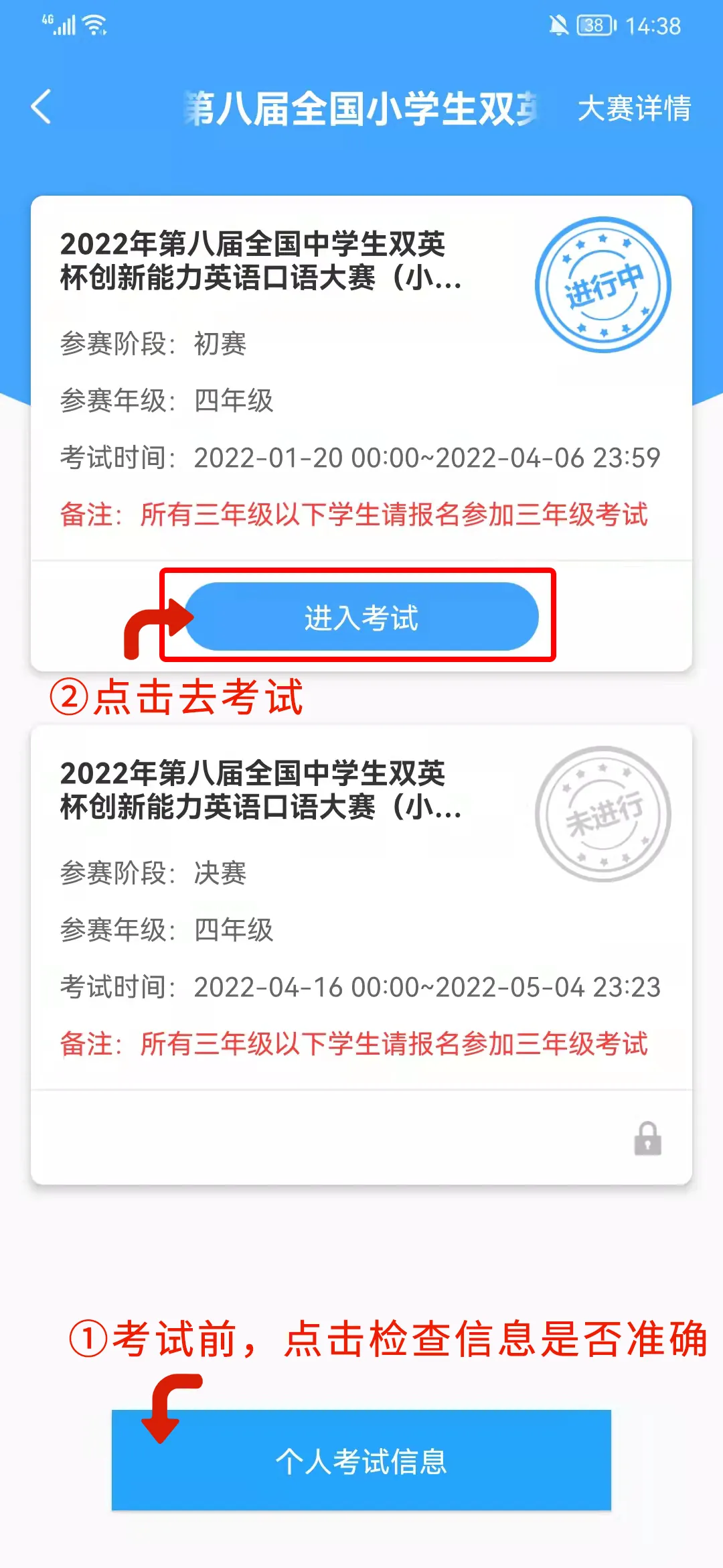 报名成功后,学生先点击查看“个人考试信息”是否正确,确认准确无误,可点击“进入考试”开始答题。