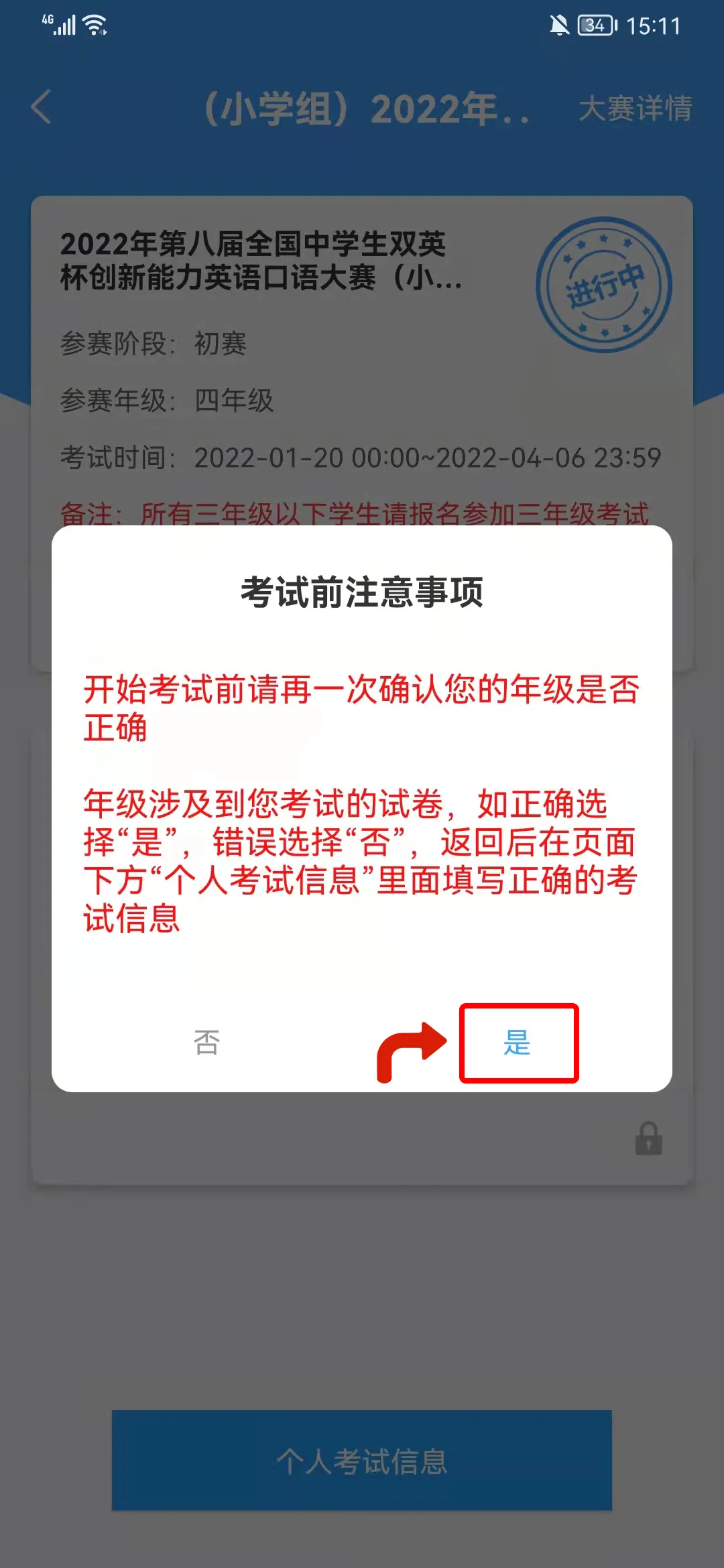 (1)确认考试信息无误,点击“是”进入考试;如果不确定信息是否正确点击“否”返回查看个人考试信息。