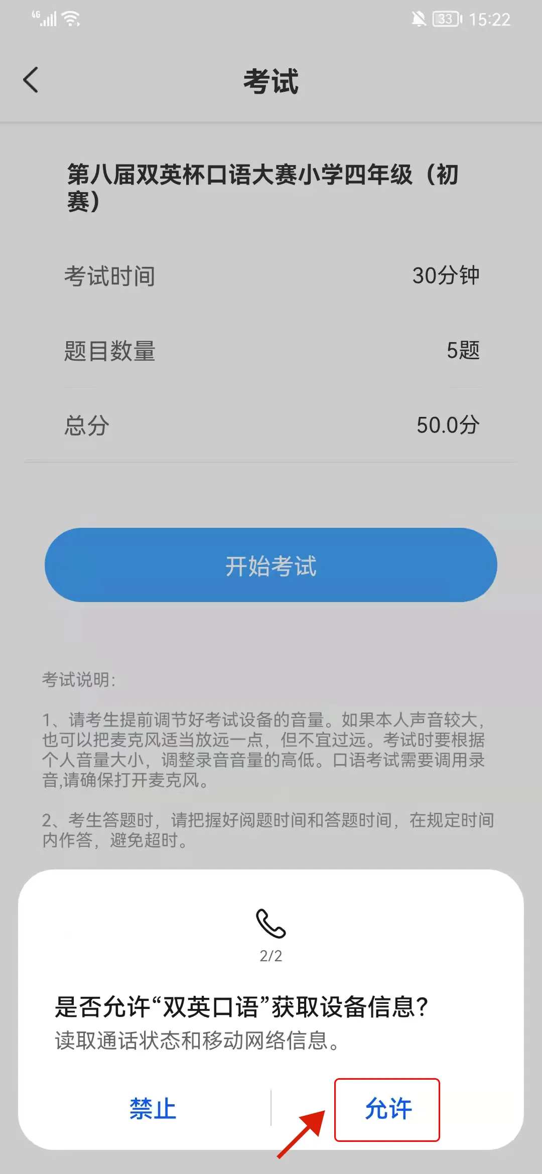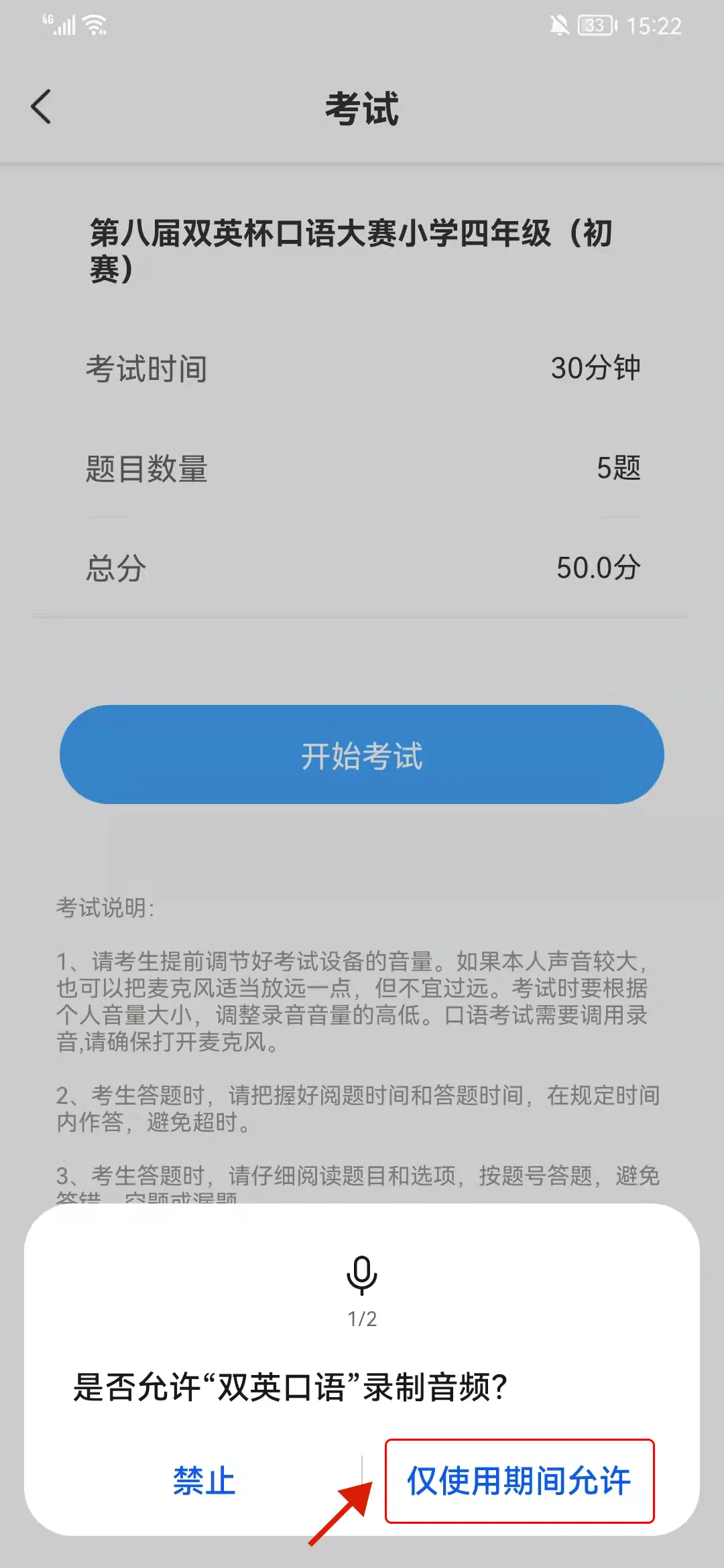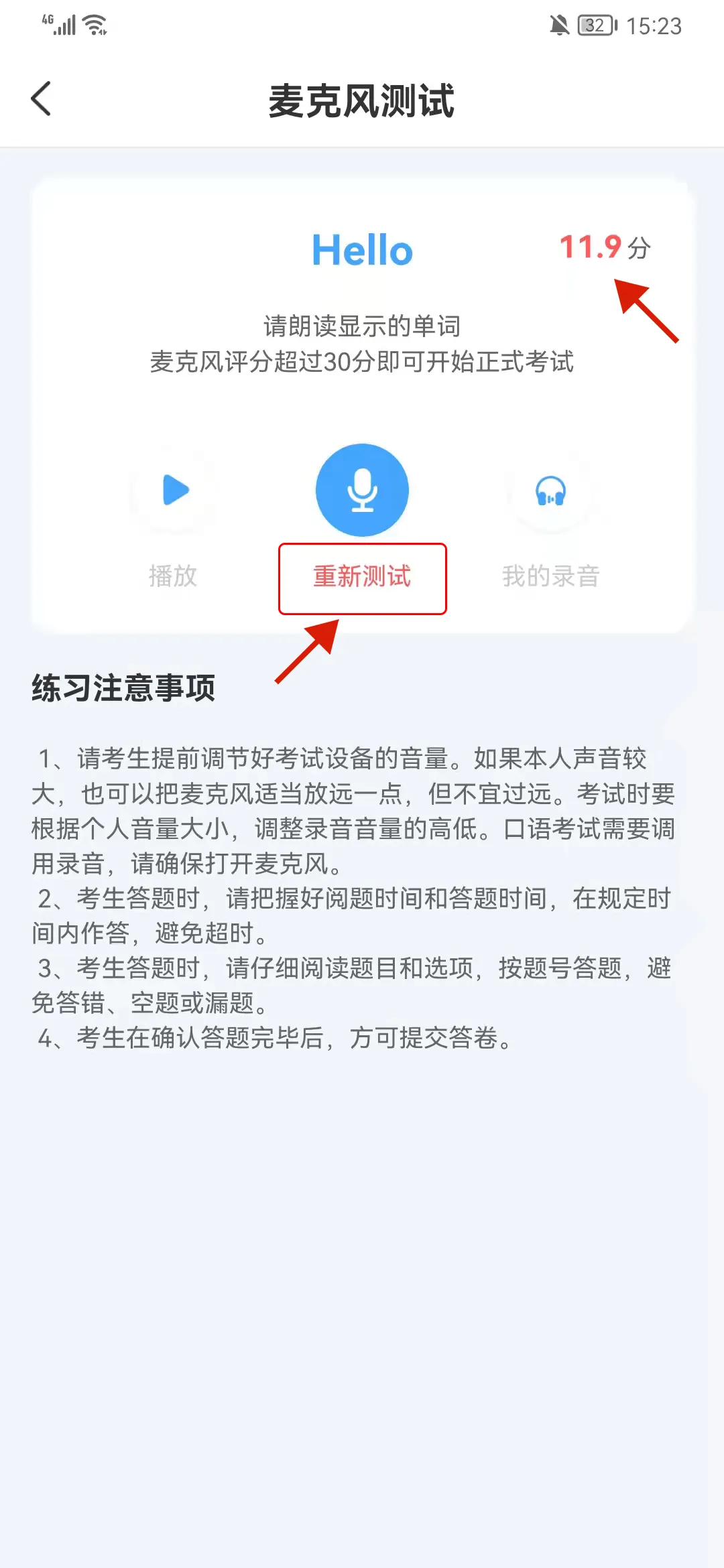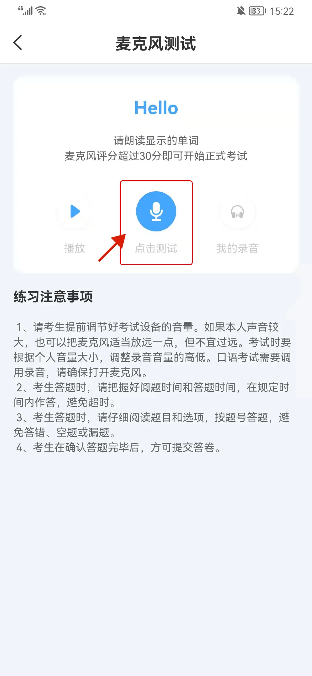 (5)允许权限后根据提示读单词,测试麦克风录音是否正常。