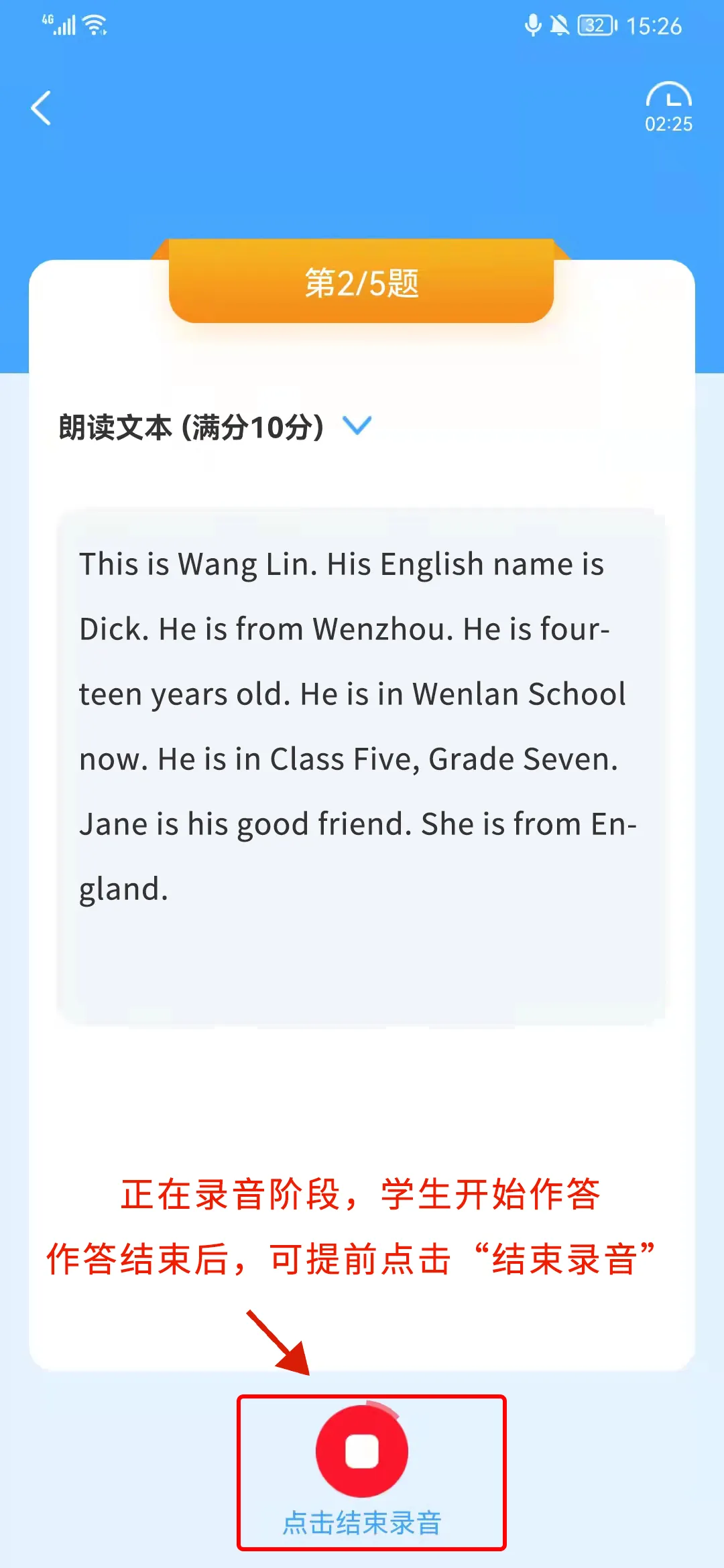 (3)录音开始,学生开始作答。作答完毕后,如果录音时间还没结束,学生可以提前点击结束录音,也可以安静等待系统自动结束录音,并跳转下一题。