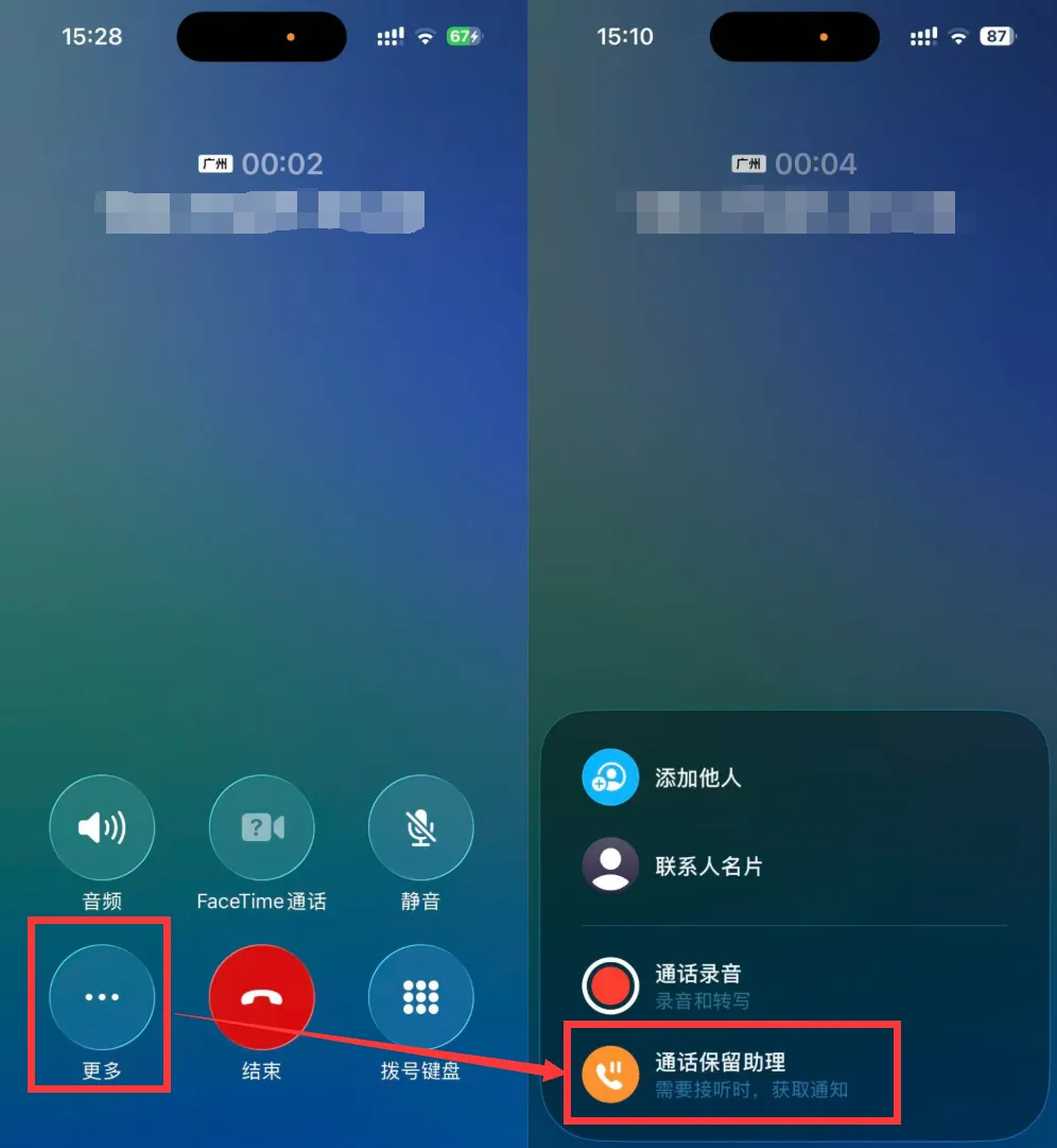 •你正在「通话」中...•iPhone 帮你「保持」通话•人工接通的那一刻,「助理」再通知你回来接